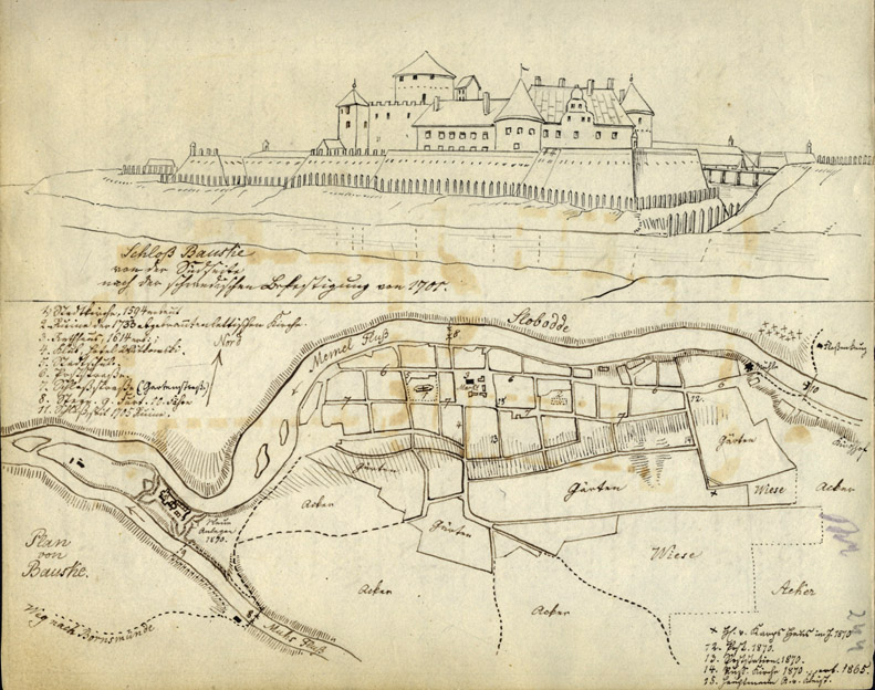 In the 1580s the township of Bauske/Bauska was transferred from the peninsula to the bank of the River Memel/Mēmele. The highway from Lithuania to Riga, passing through Bauske/Bauska, promoted the growth of the township, but because of the confusion of the war, Bauska received its town charter relatively late in 1635. In accordance with the police regulations approved by Duke Frederick, the town council was to include the Town Mayor (Bürgermeister), bailiff (Vogt) and five councillors. Bauske/Bauska was the only one of the duke’s towns where use of the “great Lithuanian measure” was permitted, while in the rest of the duchy the Riga measures were to be used. Döring has copied the depiction of Bauske/Bauska Castle from an early 18th century engraving. Clearly visible in the foreground is the block of the castle built in the 1590s, with a Late Renaissance style gable.