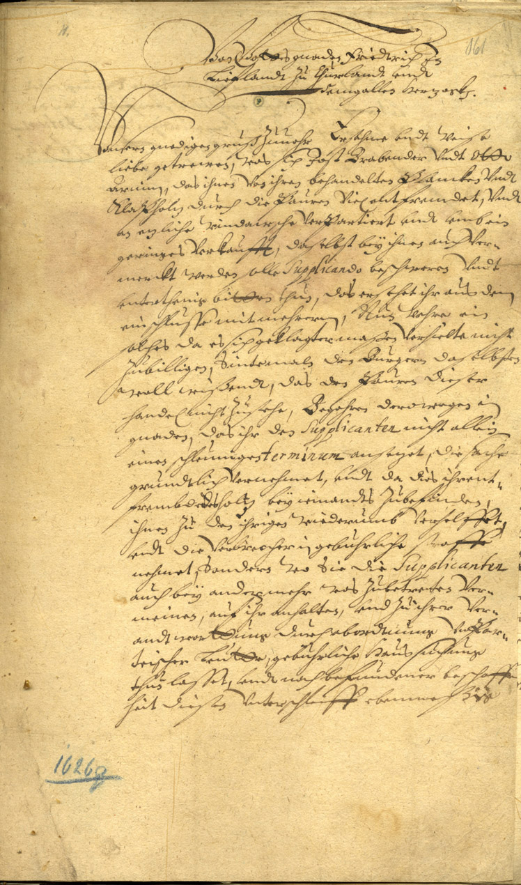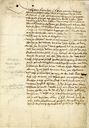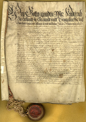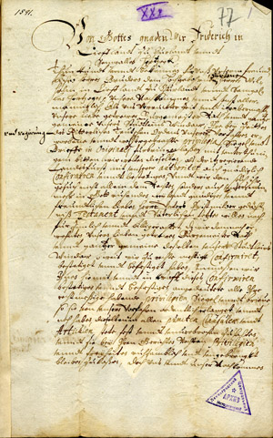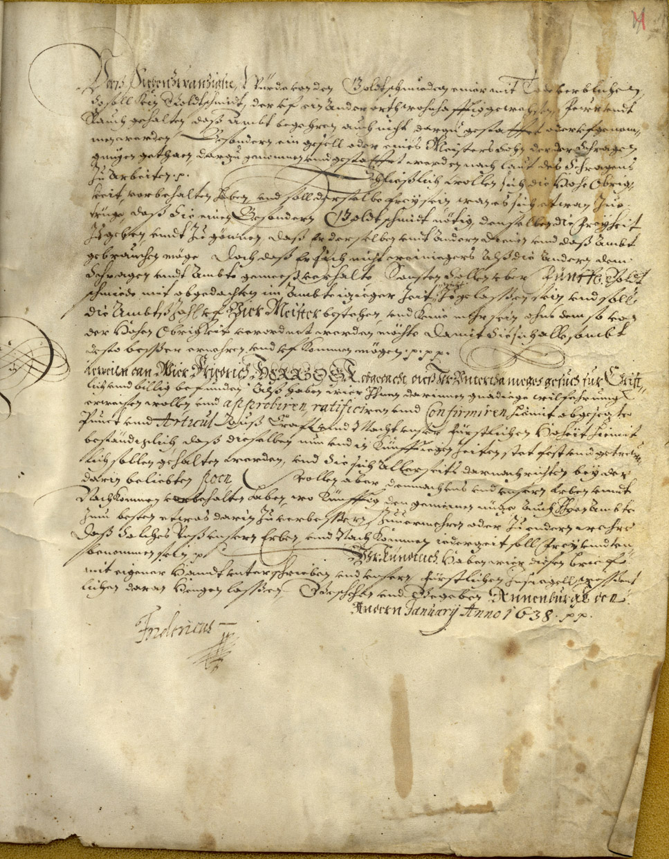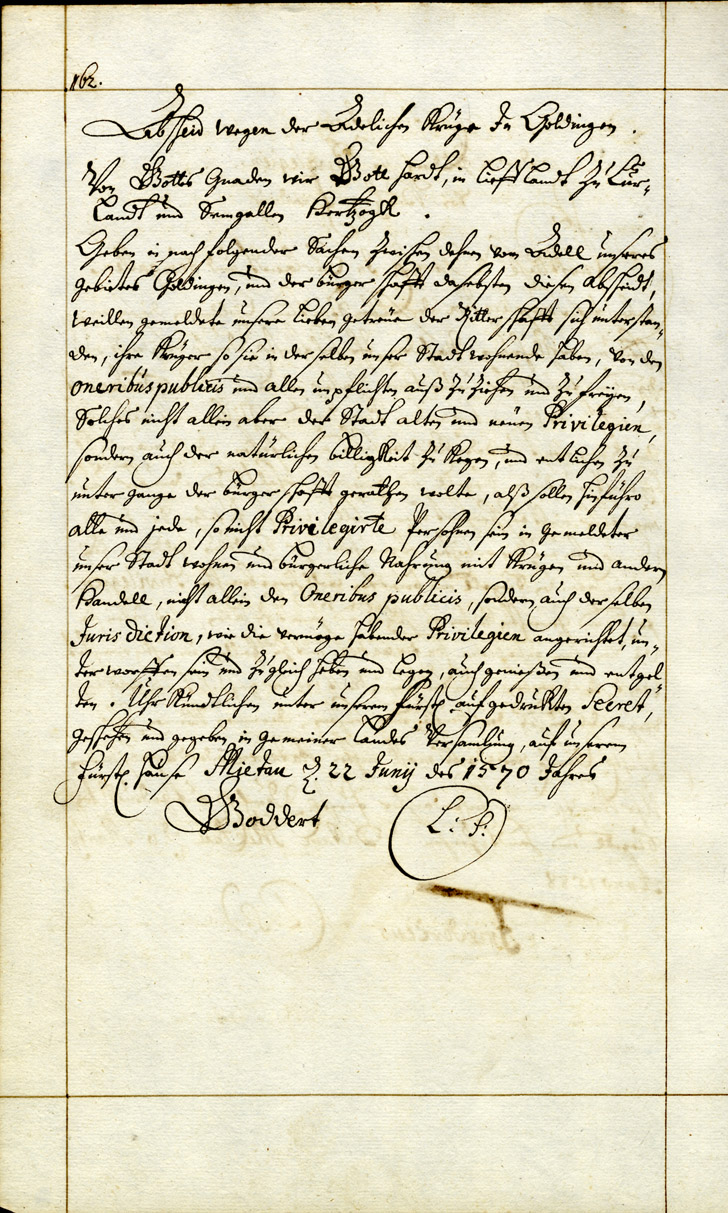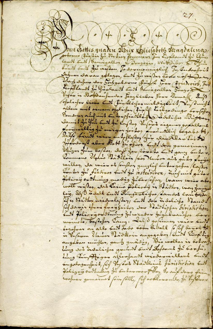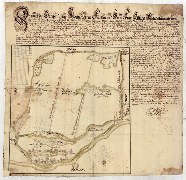 The duchess announces her intention to re-establish the ‘New Township’ (Neustädtchen, Neues Städtlein), which had been destroyed in the war “out of gratitude towards the deceased duke, but especially to the glory of God and the general good” and to name it Friedrichstadt. The duchess also indicates that the nobles who live or in future will live in this town must affirm by their signature their readiness to submit to the jurisdiction of the town and its regulations.