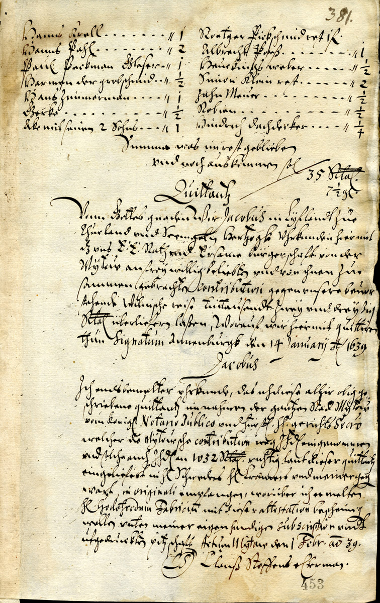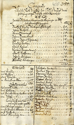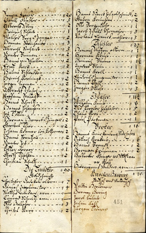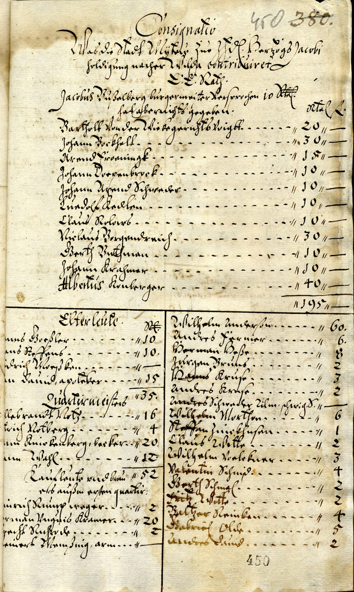 The list includes the citizens who had paid an extraordinary tax or contribution. This money was intended to cover the expenses for Duke James' trip to Vilnius to receive his fief. Each citizen paid according to his own wishes and means. For example, it is noted that Town Mayor (Bürgermeister) Jakob Busselberg had promised to pay 10 thalers, but had given nothing, the bailiff (Vogt) Bartold von der Wieke had paid 30 thalers, and the rest of the town councillors had given 1040 thalers. Among the merchants, only Wilhelm Anderson had been particularly generous, giving 60 thalers. The most prestigious of the craft corporations, the Corporation of Goldsmiths, which, in addition to nine goldsmiths, also included the watchmaker Jakob Wulf and painter Nikolaus Franck, together collected 27 thalers, although two of the goldsmiths had been recognised as poor and did not pay at all. Most of the citizens gave a few thalers.