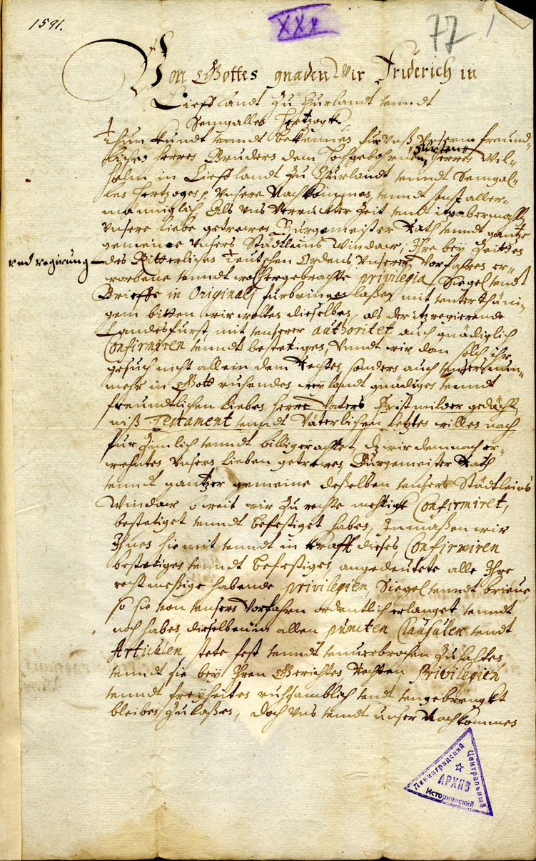 17. Confirmation of the privileges granted to the town of Windau/Ventspils by Duke Frederick. Bauske/Bauska, 7 May 1591. Authorised copy. LVVA, Collection 554, Inventory 1, File 61.