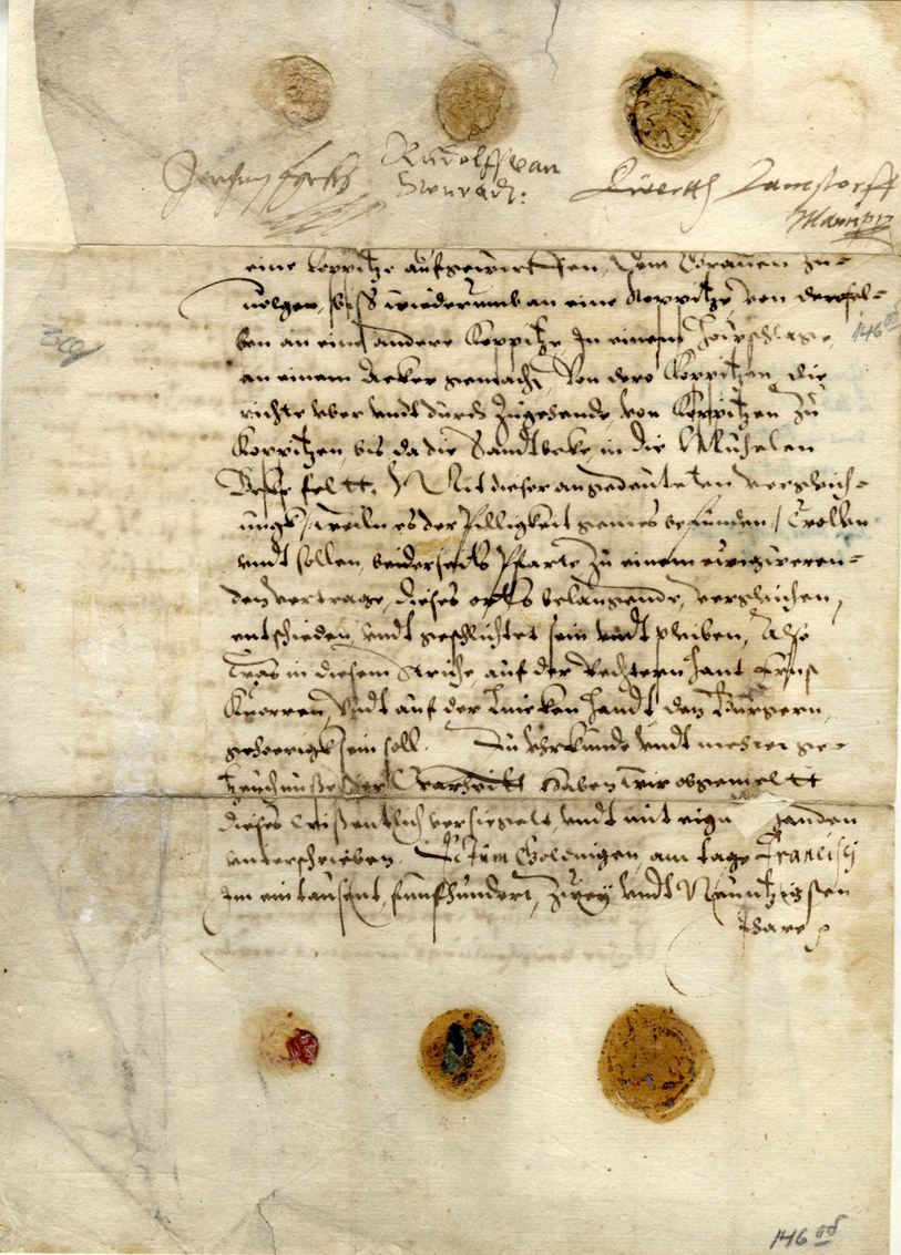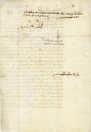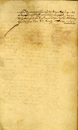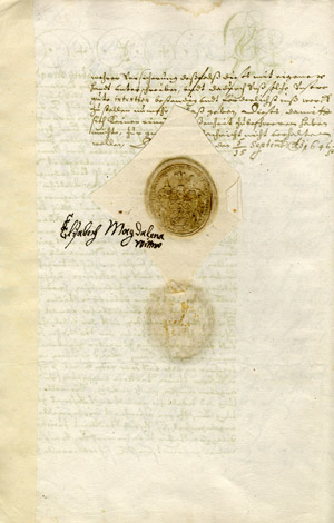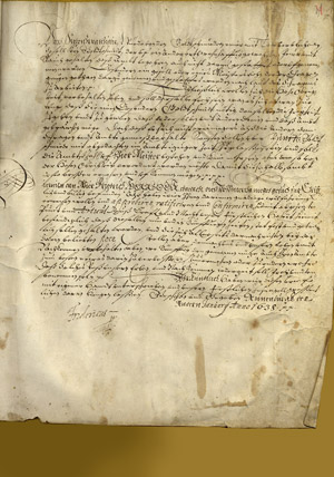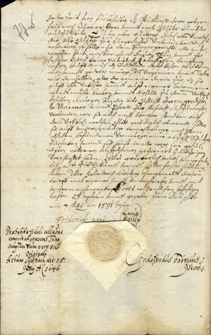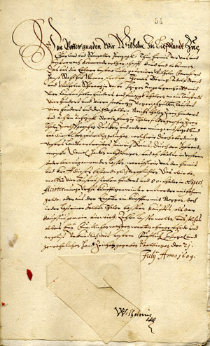 The towns of the Duchy of Courland were not fortified, Mitau/Jelgava being an exception in this regard, protected by earthworks in the 1650s. However, every town had not only an urban area, but also a rural district with communal and private pasture, fields and meadows. The extent of the lands of the town is described in the descriptions of the town's boundaries and in boundary agreements. In this particular case the Captain of Goldingen/Kuldīga, Georg Fircks, together with two witnesses, had inspected the boundary markers erected on the boundary between the land belonging to the town of Goldingen/Kuldīga and the landholding of Ernst Knorre5. Promissory note of Duke William to residents of Libau/Liepāja. Goldingen/Kuldīga, 21 July 1609. LVVA, Collection 554, Inventory 1, File 70.