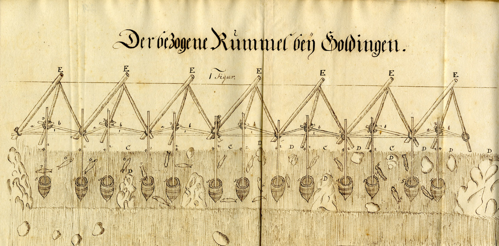 2. Catching fish at the River Windau/Venta Falls. 1730s. Drawing by Jonhann Georg Weigand. LVVA, Collection 7363, Inventory 3, File 951.