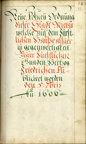 13. The new public order or police regulations of the town of Mitau/Jelgava. Proclaimed on 5 September 1606 in Mitau/Jelgava Castle in the presence of Duke Frederick. Excerpt. LVVA, Collection 640, Inventory 3, File 627.
