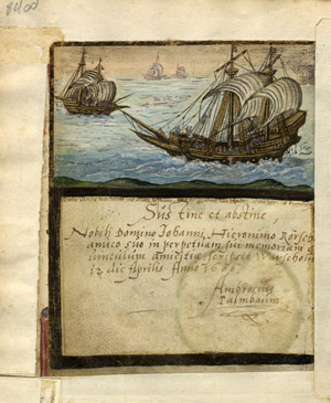 9. Ships in the Baltic Sea. Drawing from 1600 in the memorial album of Johann Hieronymus Rörscheidt. LVVA, Collection 5759, Inventory 2, File 1403.