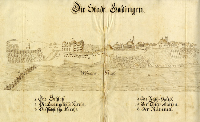 1. Panorama of Goldingen/Kuldīga. 1730s. Drawing by Jonhann Georg Weigand. LVVA, Collection 7363, Inventory 3, File 951.
