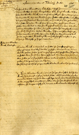 Lübeck ship's carpenter Balzer Jacobs had brought before the court a complaint about two local people, the brothers Martin and Peter Knak, who, he said, had beaten him up the previous Sunday. Jacobs had wanted to pay for beer, when Martin had come up and started hitting him. He had also knocked his purse from his hands, the money had fallen out and could not be regained. Jacobs demanded that the brothers compensate his losses, the bodily harm they hade done and the dishonour, and should be duly punished. Martin said that he had hit Jacobs because the latter had gravely insulted his brother, and said he had witnesses to prove it. Since Martin claimed he had witnesses and Peter Knak was not present at court, it was decided that the trial should be adjourned and that the witnesses should first be interrogated.