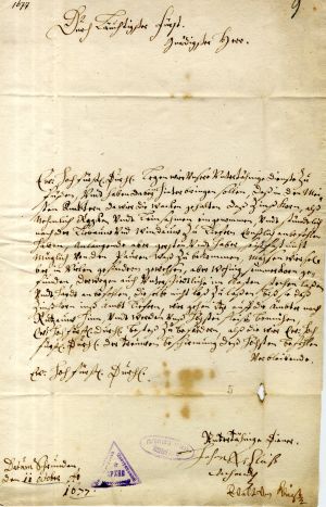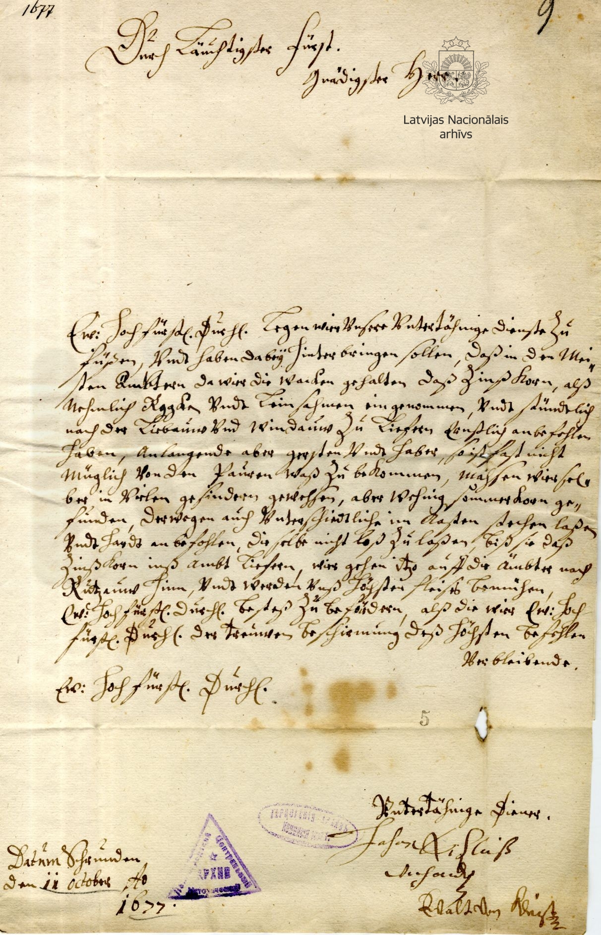 11. Report to the duke by Johann Nikolaus Wiegandt, Captain of Schrunden/Skrunda Castle, and stable master Ewald von Kleist. Schrunden/Skrunda, 11 October 1677. LVVA, collection 554, inventory 1, file 368, p. 9.