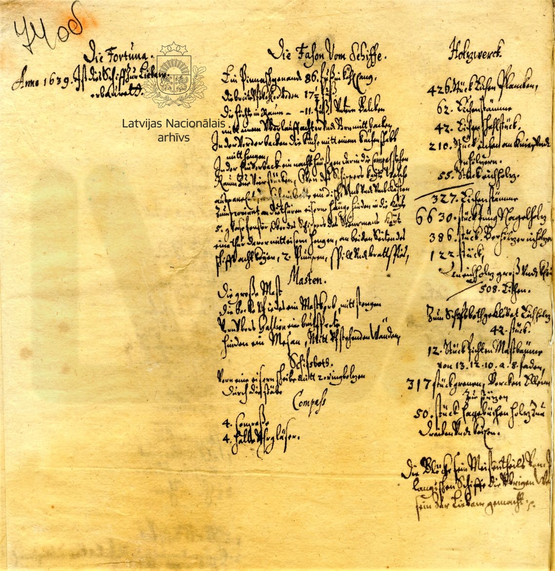 It has been asserted in the literature until now that James built his first ships in Goldingen/Kuldīga. However, the sources do not confirm this. The inventories of ships recently discovered in the document collections of the Dukes of Courland indicate that the first two ships in Duke James’s fleet were built in Libau/Liepāja: the pinnace Fortuna in 1639 and the ship St. Jacob in 1639/1640. However, already in the second half of the 1640s the shipyard was transferred from Libau/Liepāja to Windau/Ventspils. The reasons for this have still not been properly established.
