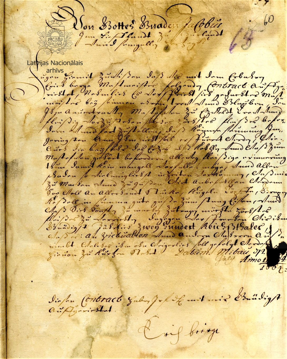 22. Duke James’s contract with blast furnace master Erich Berg. Mitau/Jelgava, 2 July 1664. LVVA, collection 554, inventory 1, file 2057, p. 60.