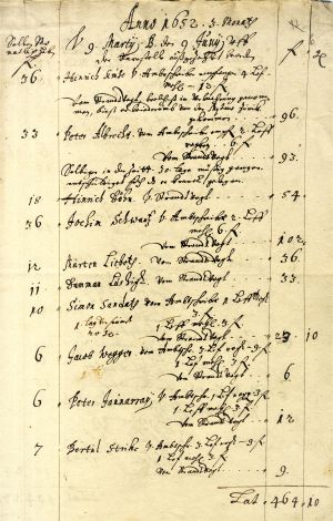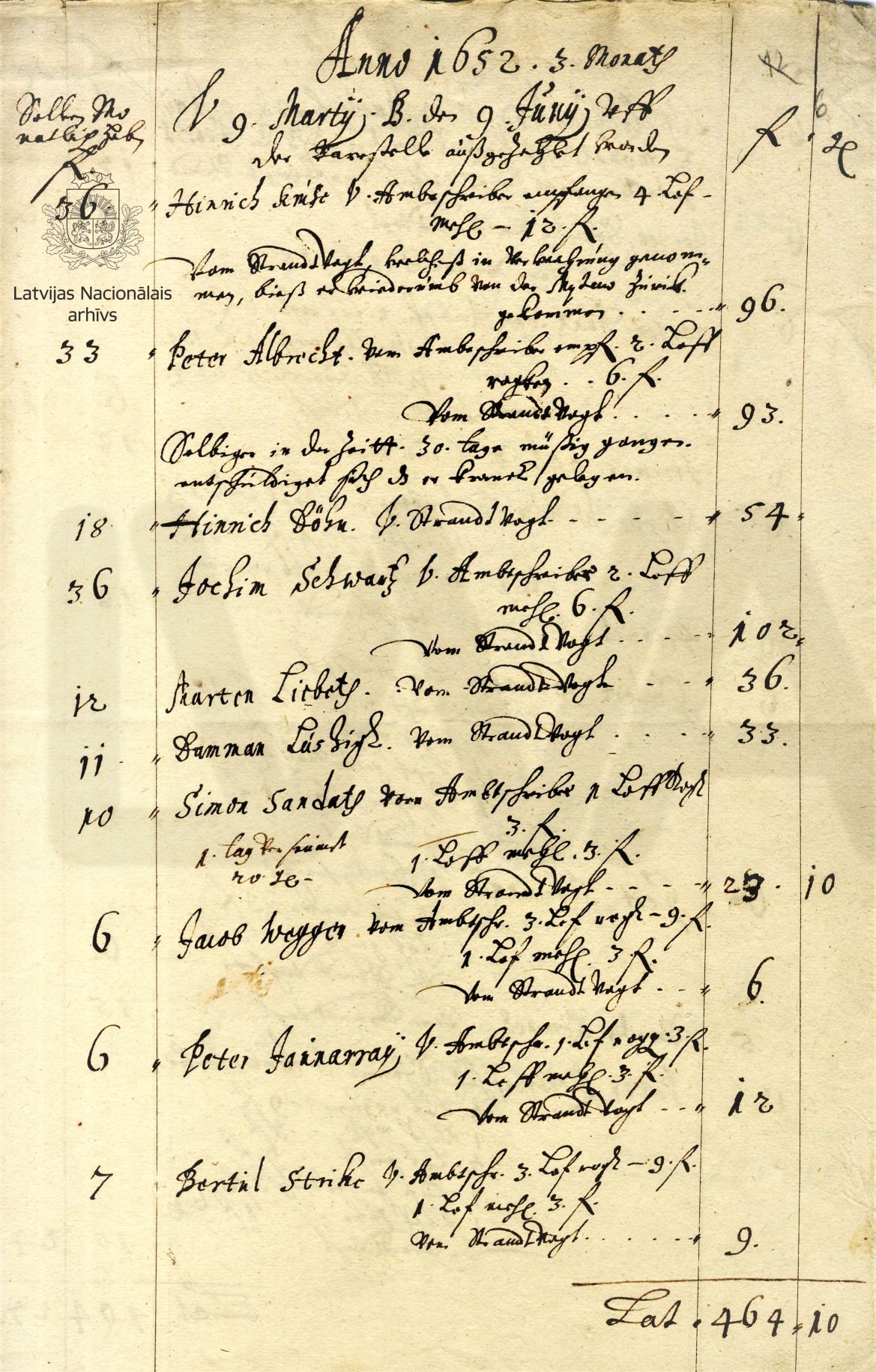 3. Wage lists of craftsmen employed at Windau/Ventspils shipyard. June 1652. Excerpt. LVVA, collection 6999, inventory 44, file 1126, pp. 6, 9.