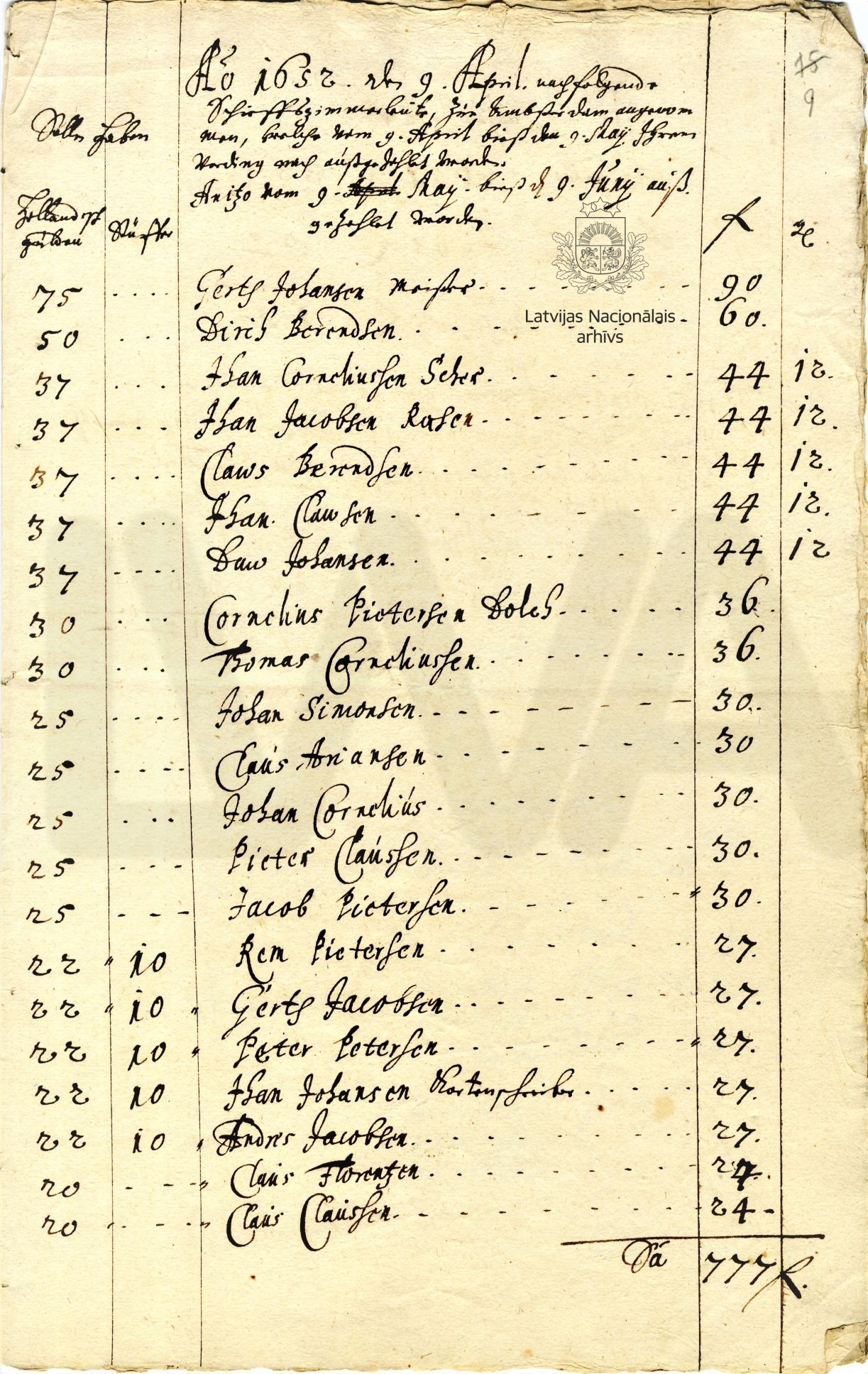 It was in the 1650s that Duke James’s fleet really developed and shipbuilding flourished. The master shipbuilders came from Lübeck, Kolberg (present-day Kołobrzeg), Sweden and Holland, and a large number of Latvians were also employed in various capacities. In 1652, the duke enlarged the Windau/Ventspils shipyard: in April he hired another 21 Dutch ship carpenters in Amsterdam, led by master shipbuilder Gert Johansen (also Gerrit Janssen). The lists give the names of the ship carpenters, their monthly pay and the actual amount they had received for the second quarter of 1652.