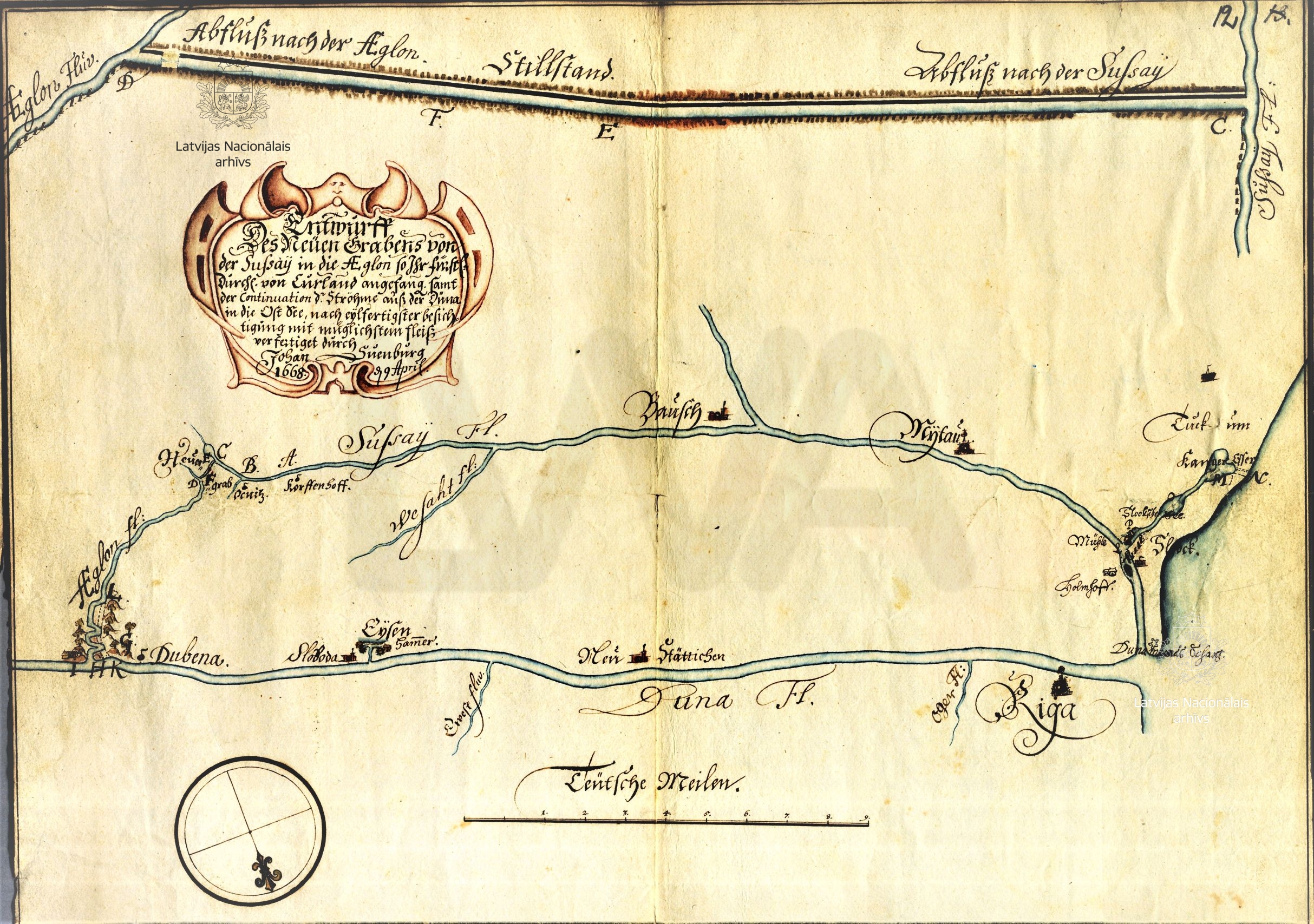 In the 1660s, Duke James decided to undertake canal-digging in order to create new waterways for transporting goods to the coast, thus circumventing Riga, which was the duke’s main competitor for trade and was, moreover, reaping the benefit of customs duties imposed on goods from Courland. In 1667, work commenced on a project to straighten and deepen the River Eglone/Eglaine and dig a canal that was to connect the Eglone/Eglaine with the Wilkup/Vilkupe (shown as Sussey/Susēja on the map). A canal was also envisaged that would connect Lake Kanjer/Kaņieris with the sea, and a passage for boats was to be built through the mill dam at Schlock/Sloka. After the Rigans heard of the work that was underway, they sent engineers Franciscus Murrer and Joachim Hardeloff as spies to the Selonia/Sēlija region in October 1667. They reported on the progress of the work and the interest shown in the new waterways by Lithuanian merchants in the border area. The following spring, engineer Johann Svenburg travelled to Courland from Riga. Alarmed at the duke’s plans, Riga town council complained to the King of Sweden. Under pressure from Sweden, in 1668 James ordered that canal-digging work be halted. At the same time, the duke himself accepted that the ambitious plans were technically impossible to realize.