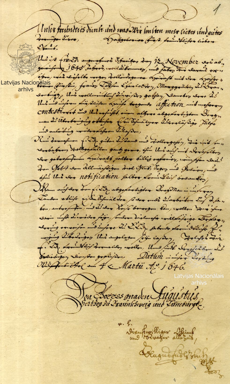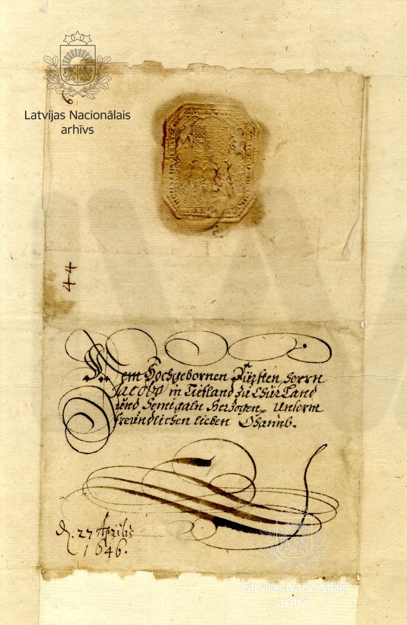 14. Letter from Augustus, Duke of Brunswick-Lüneburg to Duke James. Wolfenbüttel, 4 March 1646. The date of receipt, 27 April 1646, appears on the envelope. LVVA, collection 554, inventory 3, file 1693, p. 1.