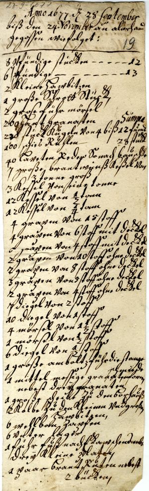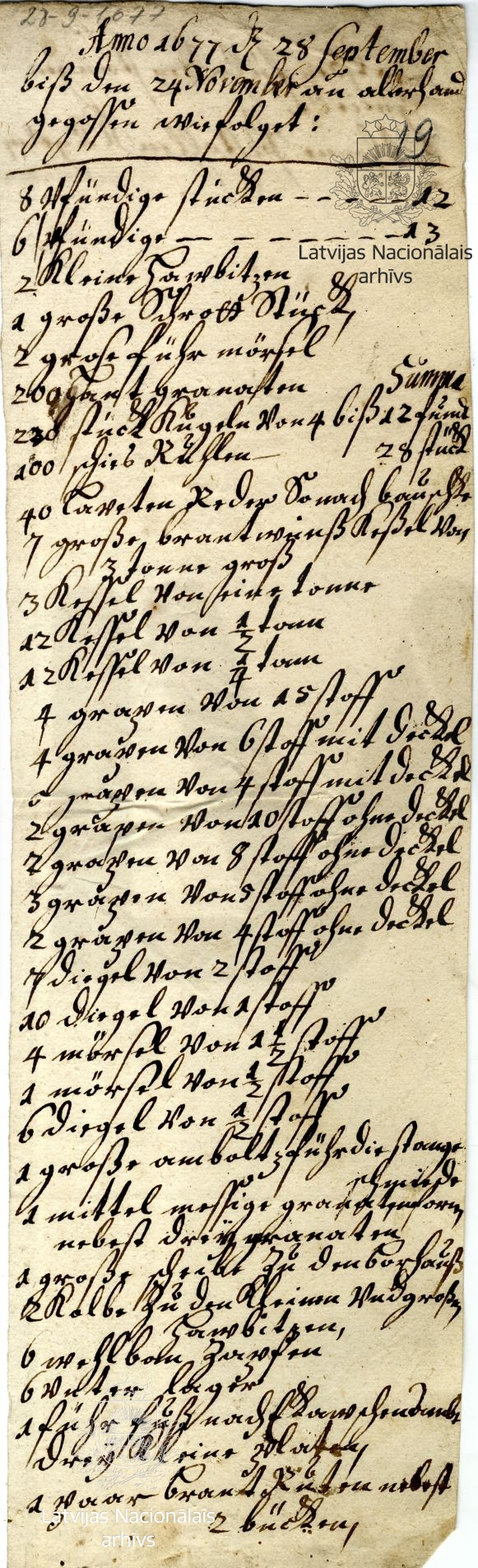 17. List of items produced at Baldon/Baldone ironworks. 1677. LVVA, collection 554, inventory 3, file 1694, p. 19.