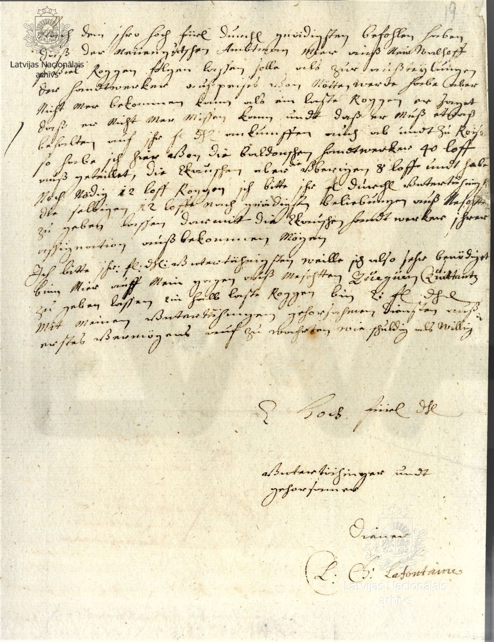 19. Report by the duke’s inspector of workshops Claude Lafontaine on the work of craftsmen from 27 April to 3 May 1678. LVVA, collection 554, inventory 3, file 1848, pp. 18–19.
