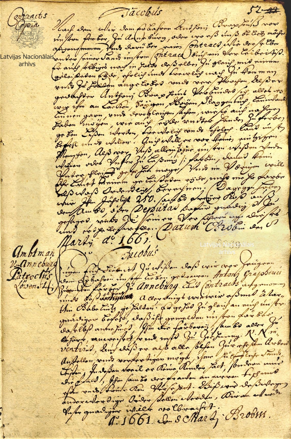 20. The duke’s agreement with fabric dyer Anthoni Grapheus and instruction to Patroclus Loewenstein, manager of Annenburg/Emburga. Grobin/Grobiņa, 8 March 1661. Copies. LVVA, collection 554, inventory 1, file 265, p. 69.