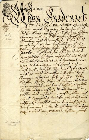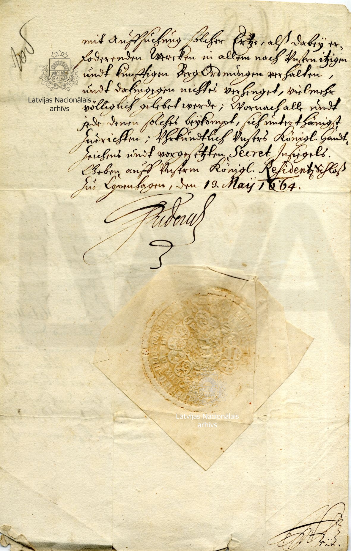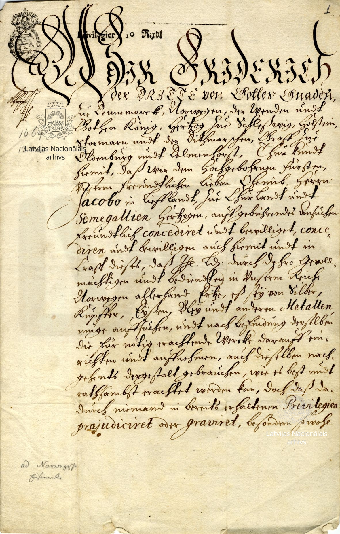 21. Privilege to Duke James granted by Frederick III of Denmark. Copenhagen, 13 May 1664. LVVA, collection 554, inventory 2, file 3146, p. 1.
