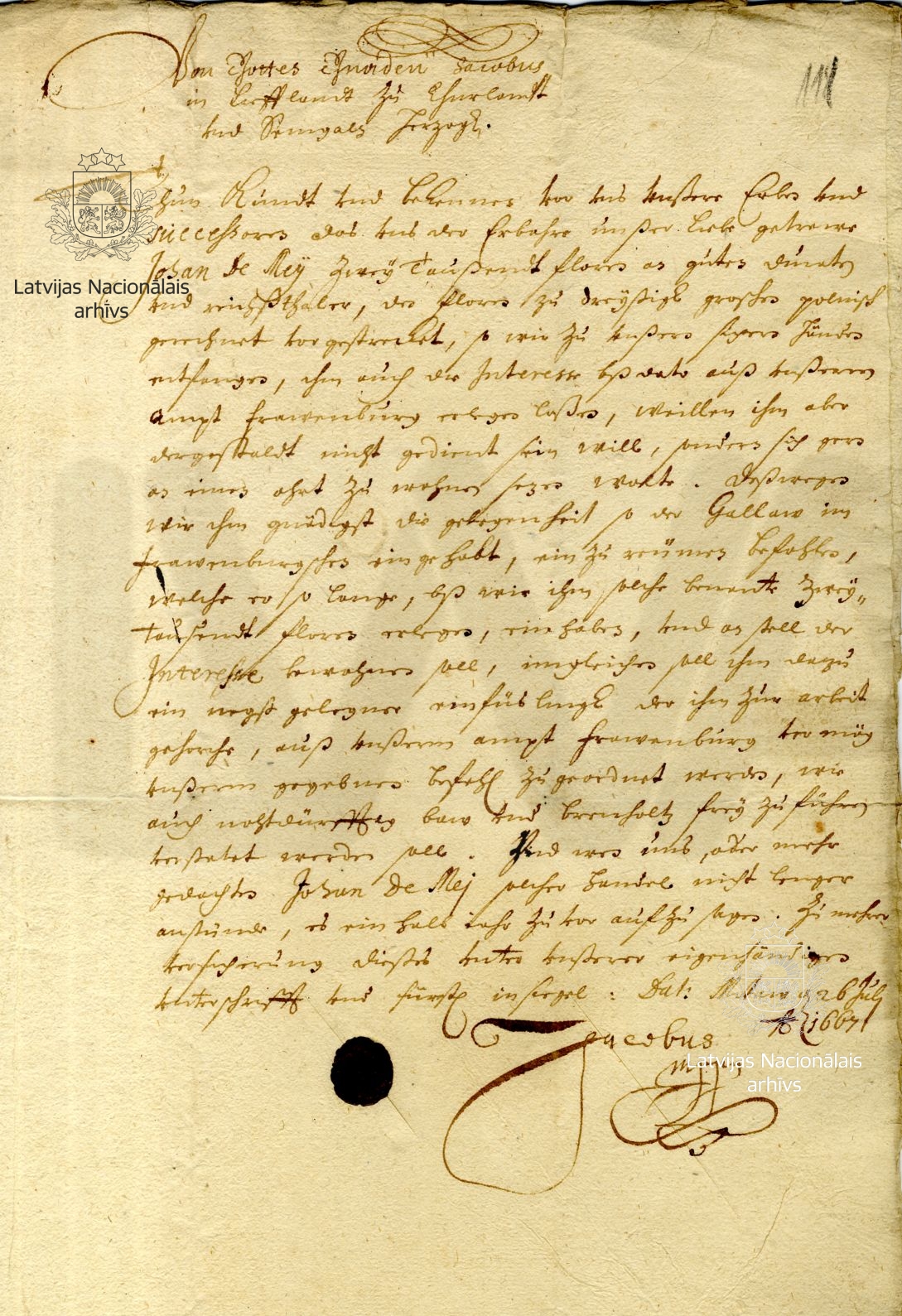 23. Announcement by Duke James. Mitau/Jelgava, 26 July 1667. LVVA, collection 554, inventory 3, file 1199, p. 111.