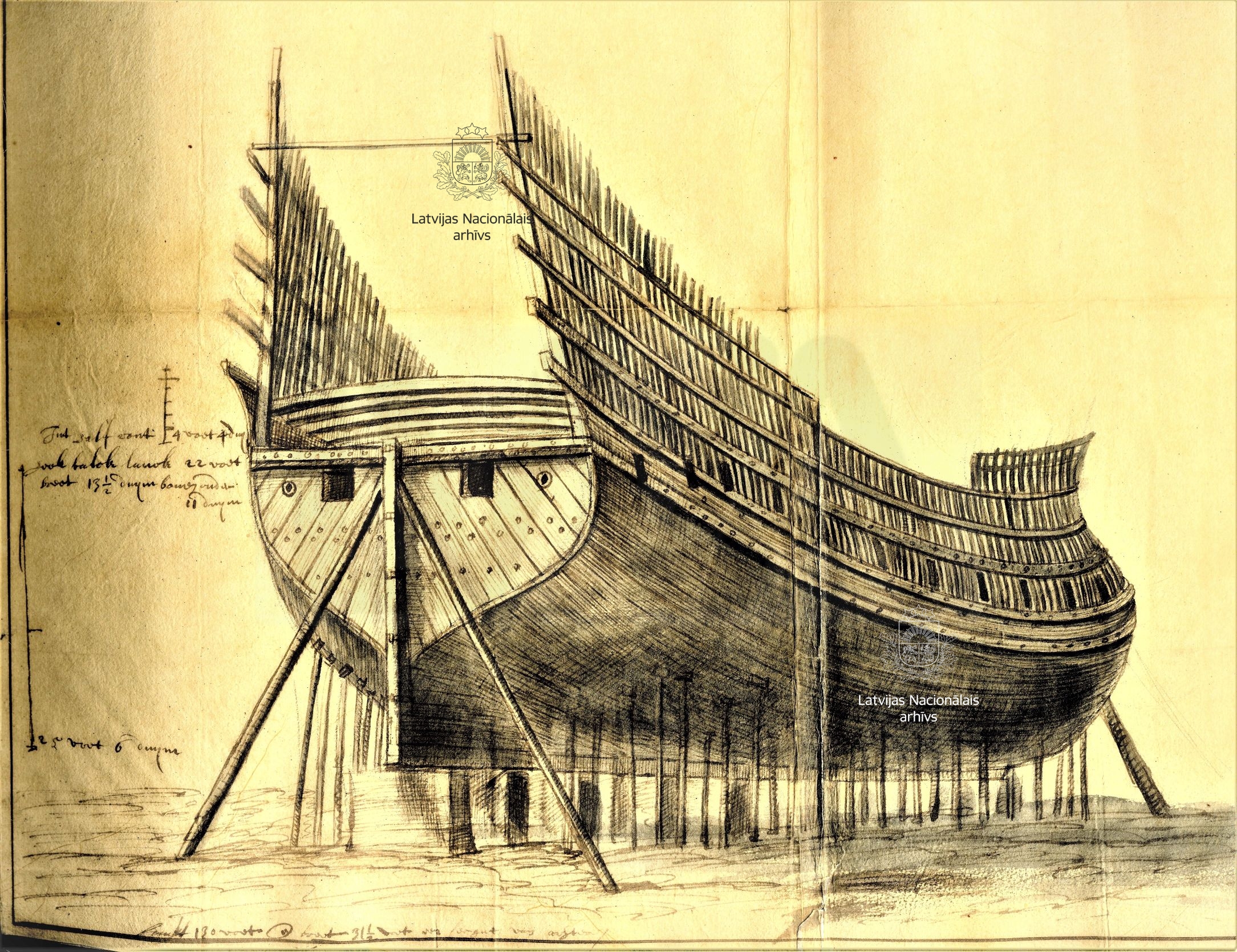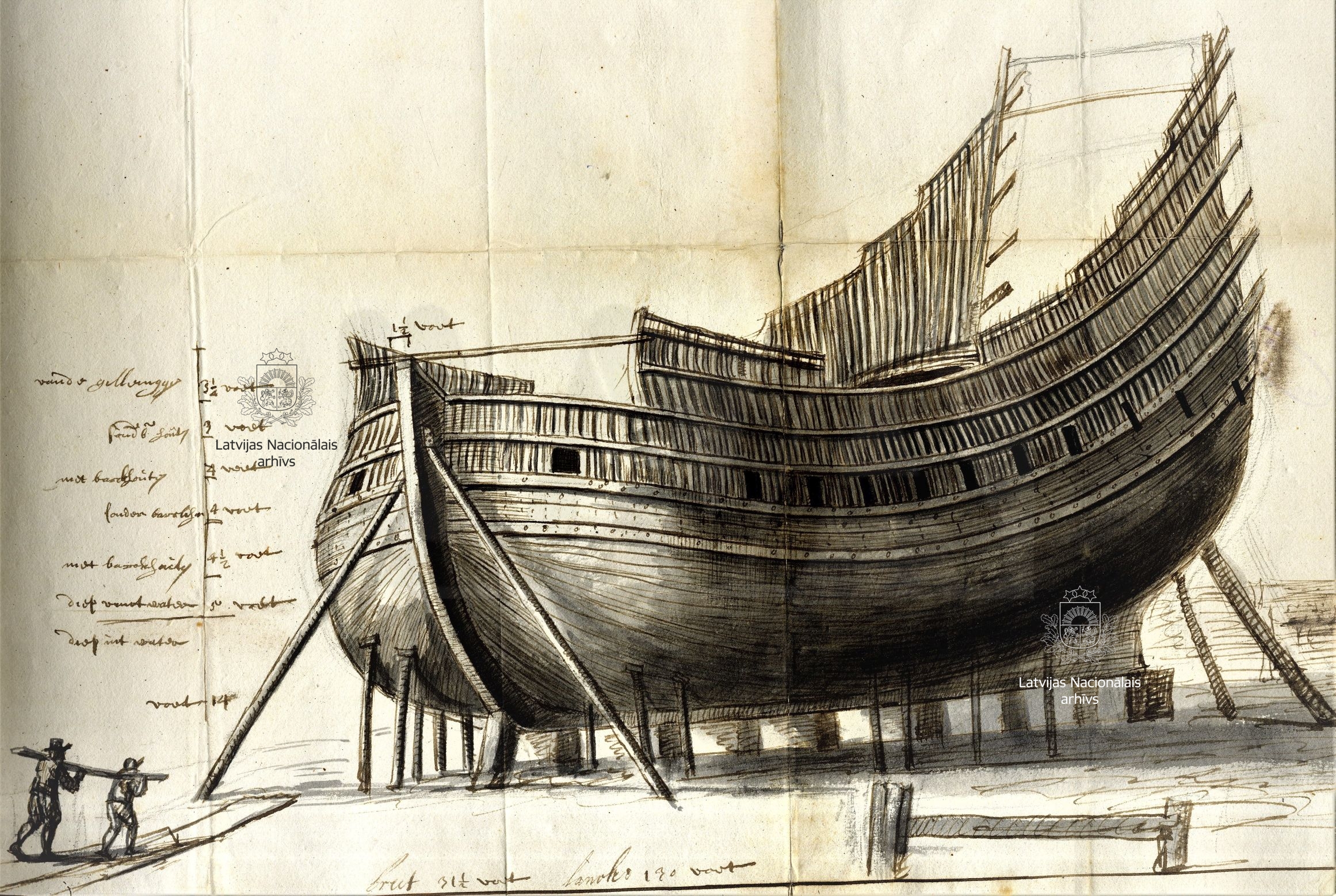 2. The process of building ships. Drawing by Johann Streck. First half of 17th century. LVVA, collection 554, inventory 1, file 850d, pp. 6, 7.