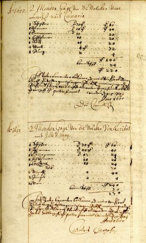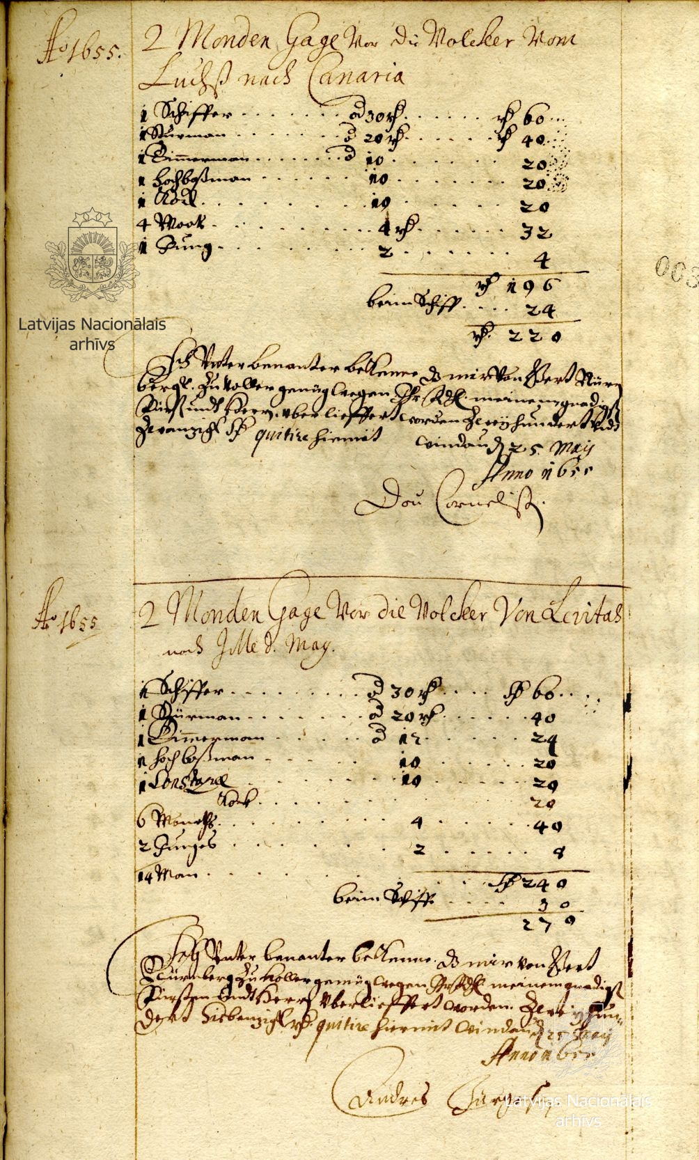 In this document, Dou Cornelissen, captain of the ship Luchs (Lynx), states that he has received 220 thalers as two-months’ pay for a crew of 10 for a voyage to the Canary Islands. Andreas Jurgensen, captain of the ship Levitas (Lightness), had received 270 thalers as two months’ pay for a crew of 14 for a voyage to the island of Maio in Cape Verde.