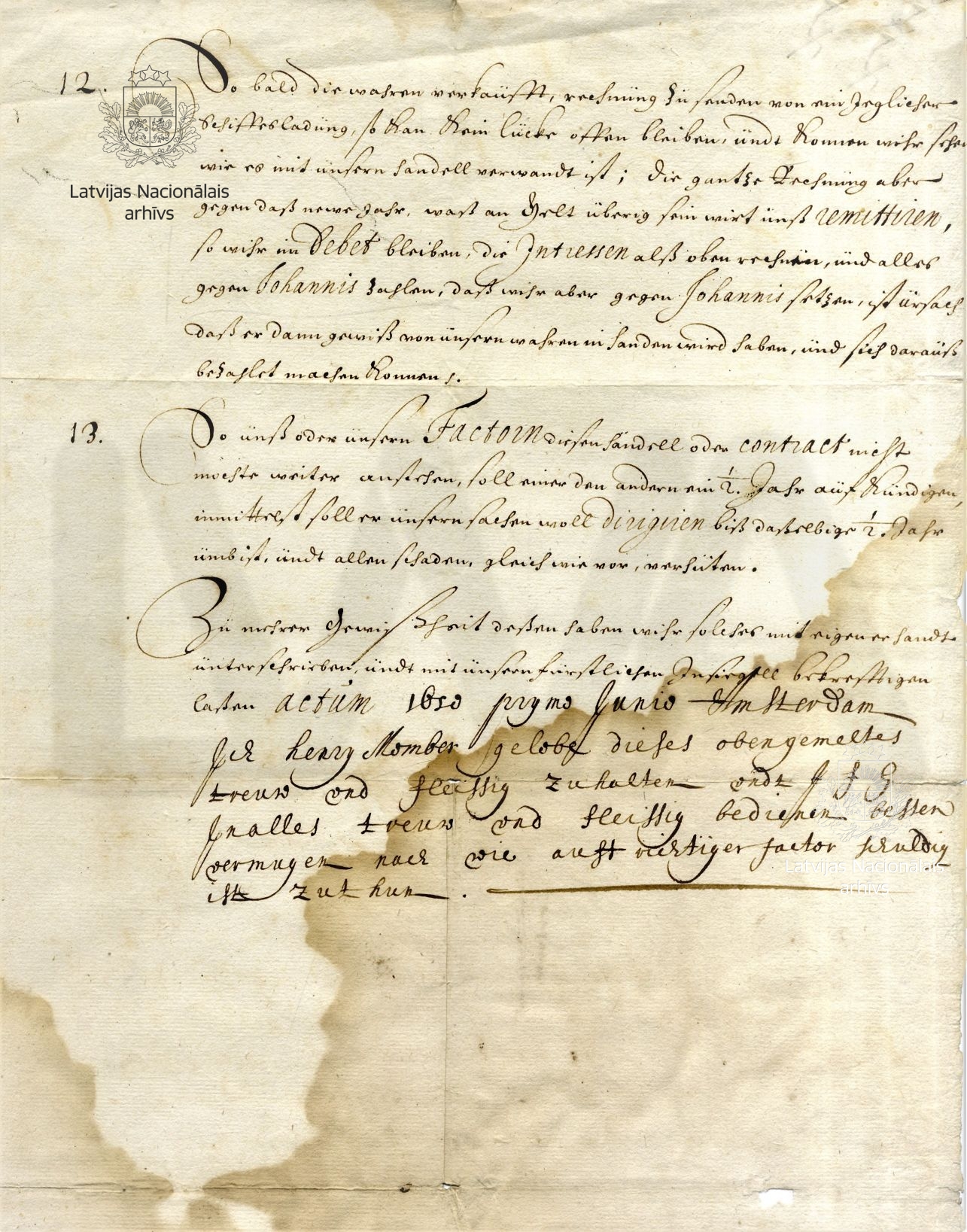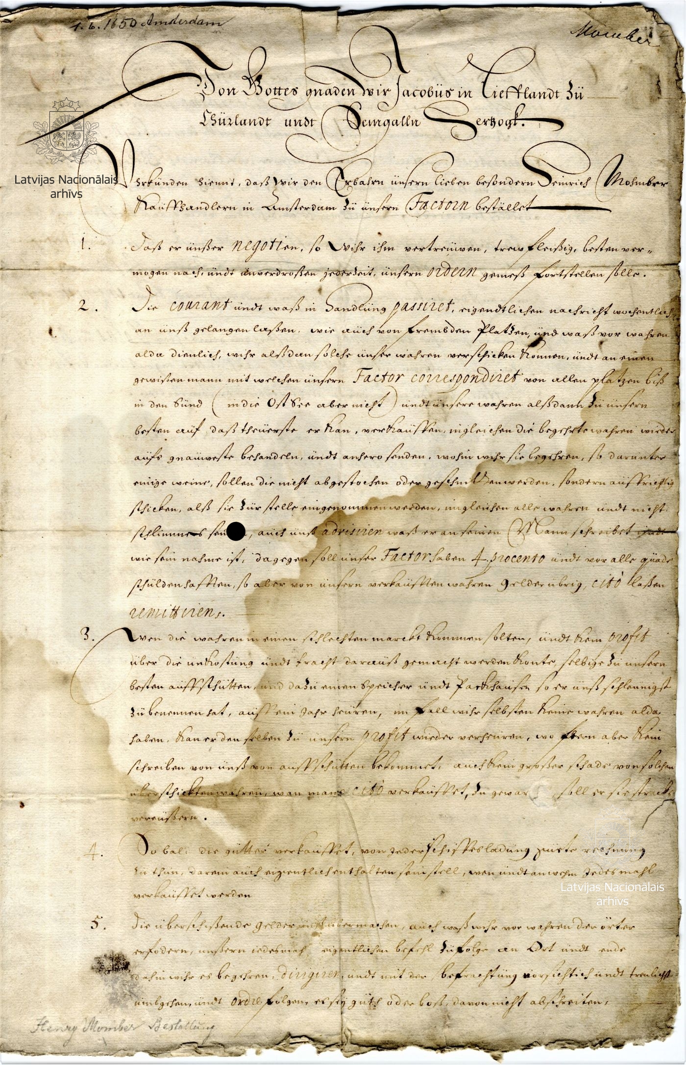 6. Agreement between Duke James and the Amsterdam merchant Henry Momber. Amsterdam, 1 June 1650. LVVA, collection 7363, inventory 3, file 439, pp. 3, 4.