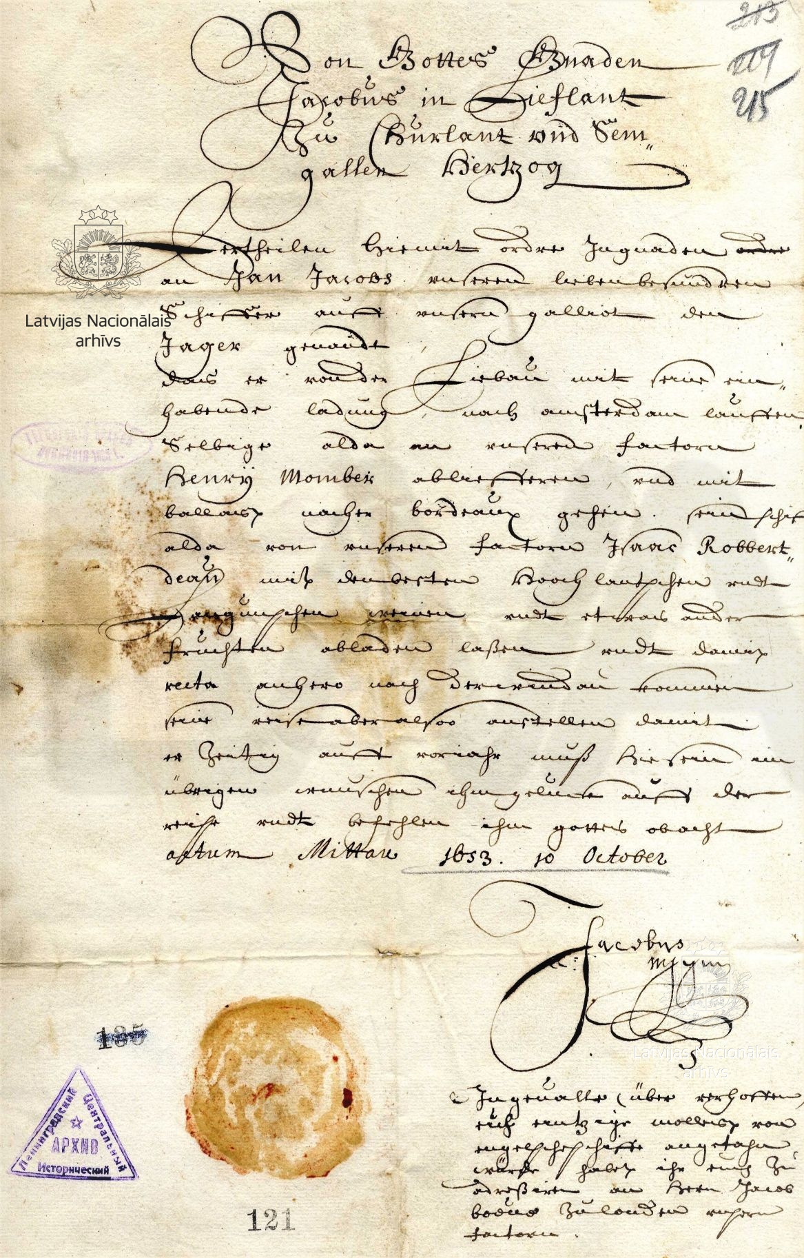 7. Instruction from Duke James to ship’s captain Jan Jacobs. Mitau/Jelgava, 10 October 1653. LVVA, collection 554, inventory 1, file 709, p. 215.