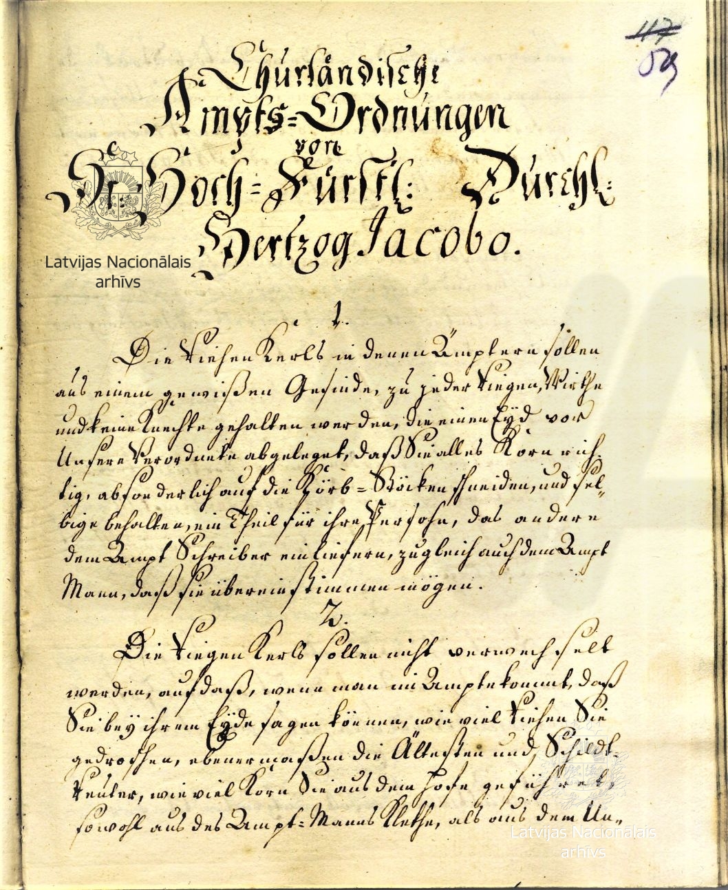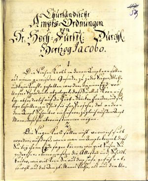8. Duke James’s administrative code (Amts-Ordnung) for the estates. 1663. Transcript. First page. LVVA, collection 5759, inventory 2, file 692, p. 59.