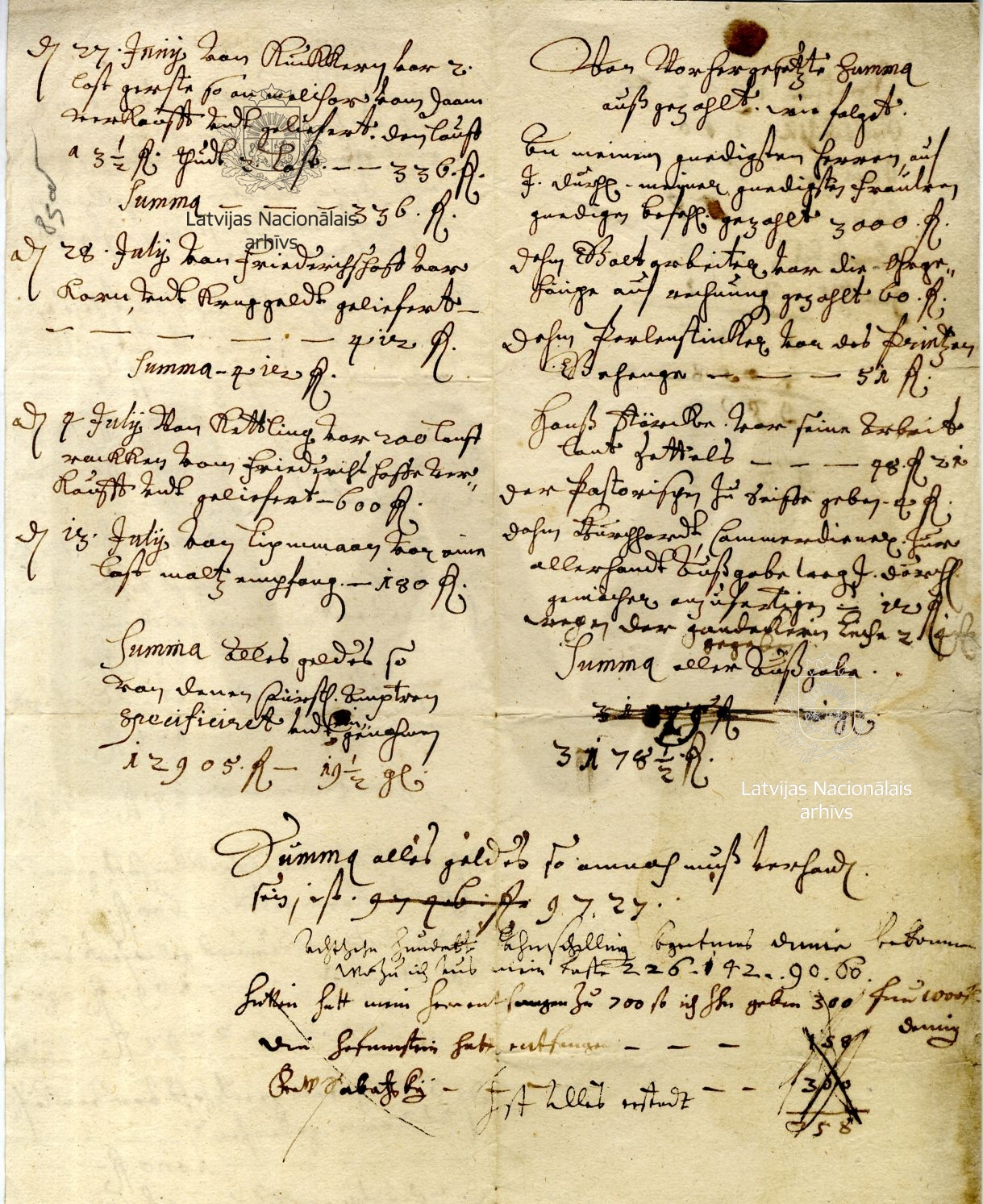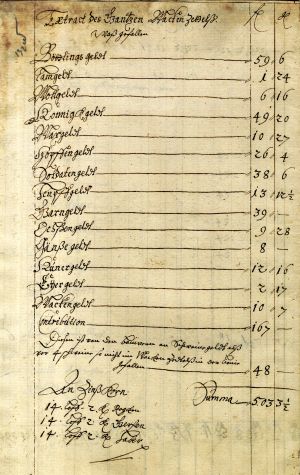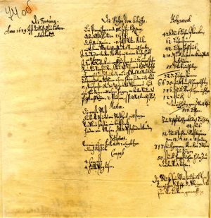In this document, Louise Charlotte’s accountant sets out the incomes received in summer 1657 from her estates of Sessau/Sesava, Fockenhof/Bukaiši, Grenzhof/Mežmuiža, Kuckern/ Ukri and Friedrichshof/Lipsti. The money came mainly from the sale of grain and malt. A total of 12,905 florins 19½ groats had been received. In accordance with an instruction from Louise Charlotte, 3000 florins had been handed over to the duke, and small sums had been paid out to cover various minor necessities, such as soap. An unnamed goldsmith had received 60 florins for making a pair of earrings for the duchess.