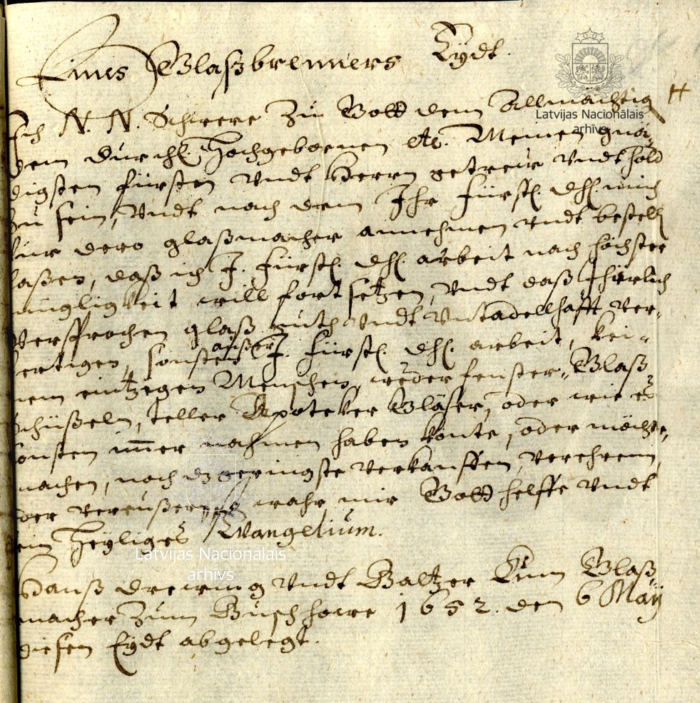 On taking up his work, the artisan swore to be loyal and diligent, to work only for the duke and not to trade in the window glass, apothecaries’ vessels, bowls and other kinds of wares being produced. Below the text is a note stating that this oath had been given on 6 May 1652 by the craftsmen of the Grossbuschhof/Birži glassworks Hans Drewing and Balzer Kum.