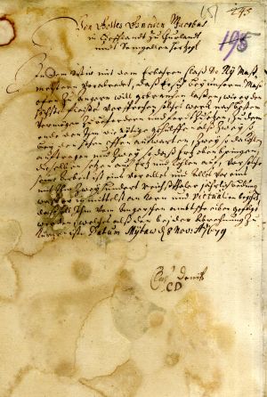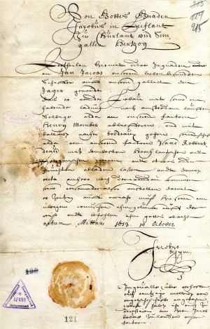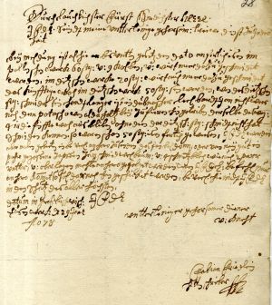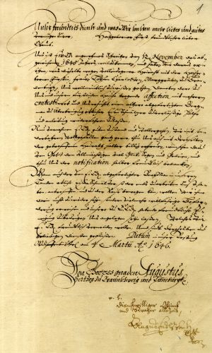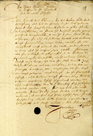 In reply to a letter from Duke James of 12 November 1646, Duke August (1579–1666) congratulates James on his marriage to Louise Charlotte, Princess of Brandenburg. He also grants permission for James to hire some iron-smelters in his lands, so that they might work in Courland.
