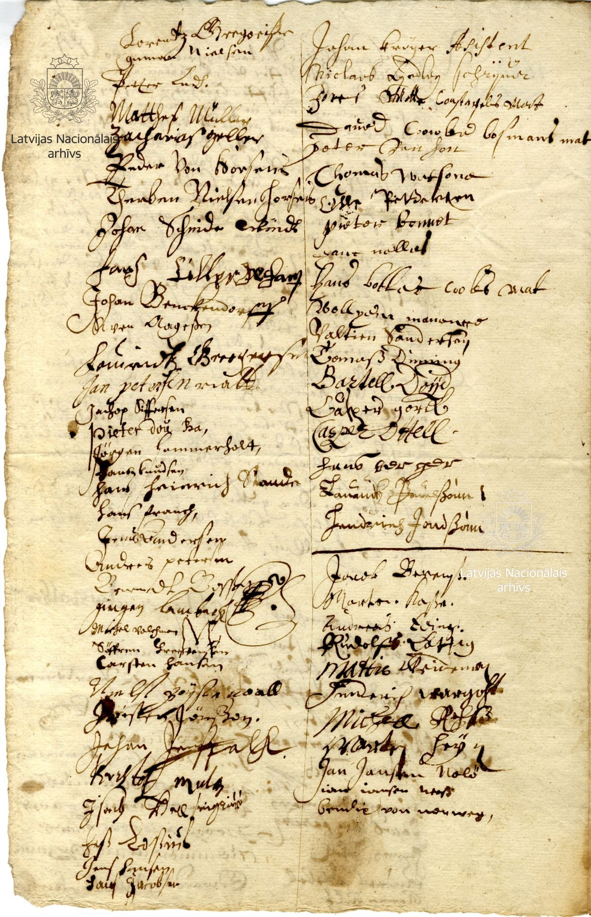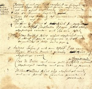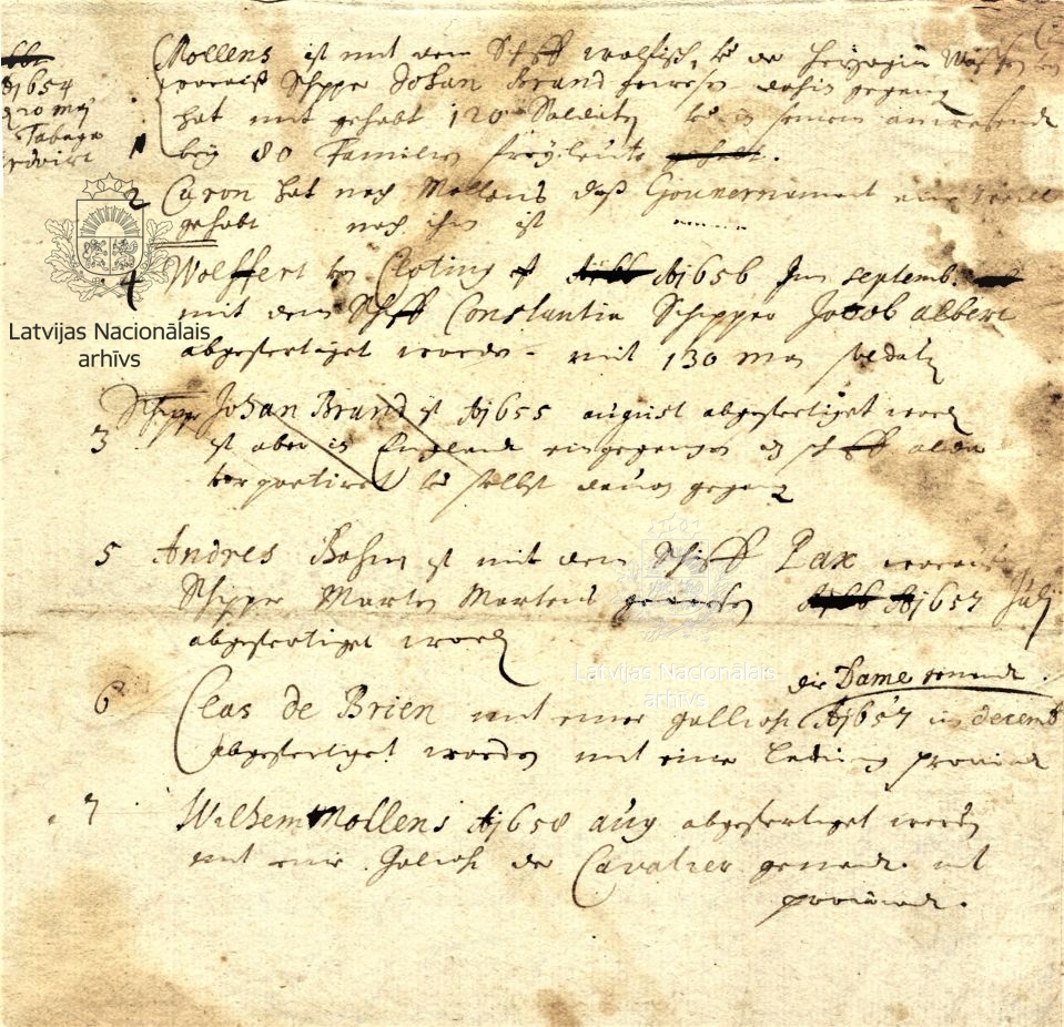 This list constitutes one of the few pieces of authentic evidence held at the Latvian State Historical Archives concerning the Courlanders’ activities on the island of Tobago during the first period of James’s rule. It records that on 20 May 1654 Tobago was reached by Willem Mollens on the ship Wallfisch (Whale) and the captain Johann Brandt on the Wappen der Herzogin von Kurland (Coat of Arms of the Duchess of Courland), bringing 120 soldiers and 80 families of freemen. After Mollens, a certain Caron served as governor for a time. He was followed by Wollfert von Clotting with 130 soldiers, brought in September 1656 by the ship Constantia (Constancy), captained by Jacob Alberts. In August 1655, the captain Johann Brandt was sent out (again), but he landed in England and abandoned the ship. In July 1657, Andreas Bohm was sent to Tobago with the ship Pax (Peace) under captain Marten Martens. In December 1657, Clas de Brien was despatched to the island on the galiot Die Dame (The Lady), bringing a cargo of foodstuffs. Willem Mollens was sent out in August 1658 on the galiot Der Cavalier (The Cavalier), with a cargo of provisions.