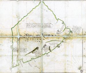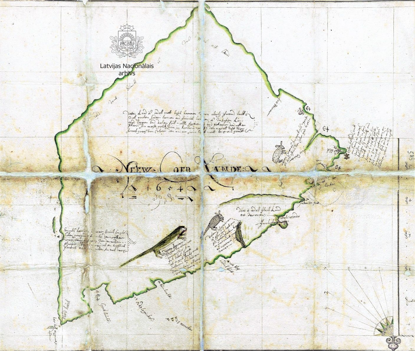 The map was drawn by one of the first colonist sent by James, who arrived on Tobago in May 1654. The colonists named the island New Courland (Neew Coerlande). The map is oriented south–north, and the annotations are in Dutch. It was compiled in the period up to 11 August, when Willem Mollens wrote to James that he was sending him a small map. The contours of the island are drawn very approximately, and it is clear that the Courlanders had not yet charted it in full, but Mollens asserted that there were no Europeans on the island. The only habitations marked on the island are Fort James (Jacobo foort) and Windau/Ventspils Village (dorch Windoo), on the shore of what would become known as Courland Bay. Evidently, by the time the Courlanders arrived on Tobago, none of the residents of the Dutch colony existing there in the 1620s–30s were still present, and the colonists sent by the Lampsins, merchants of Vlissingen, arrived no earlier than the autumn of 1654.