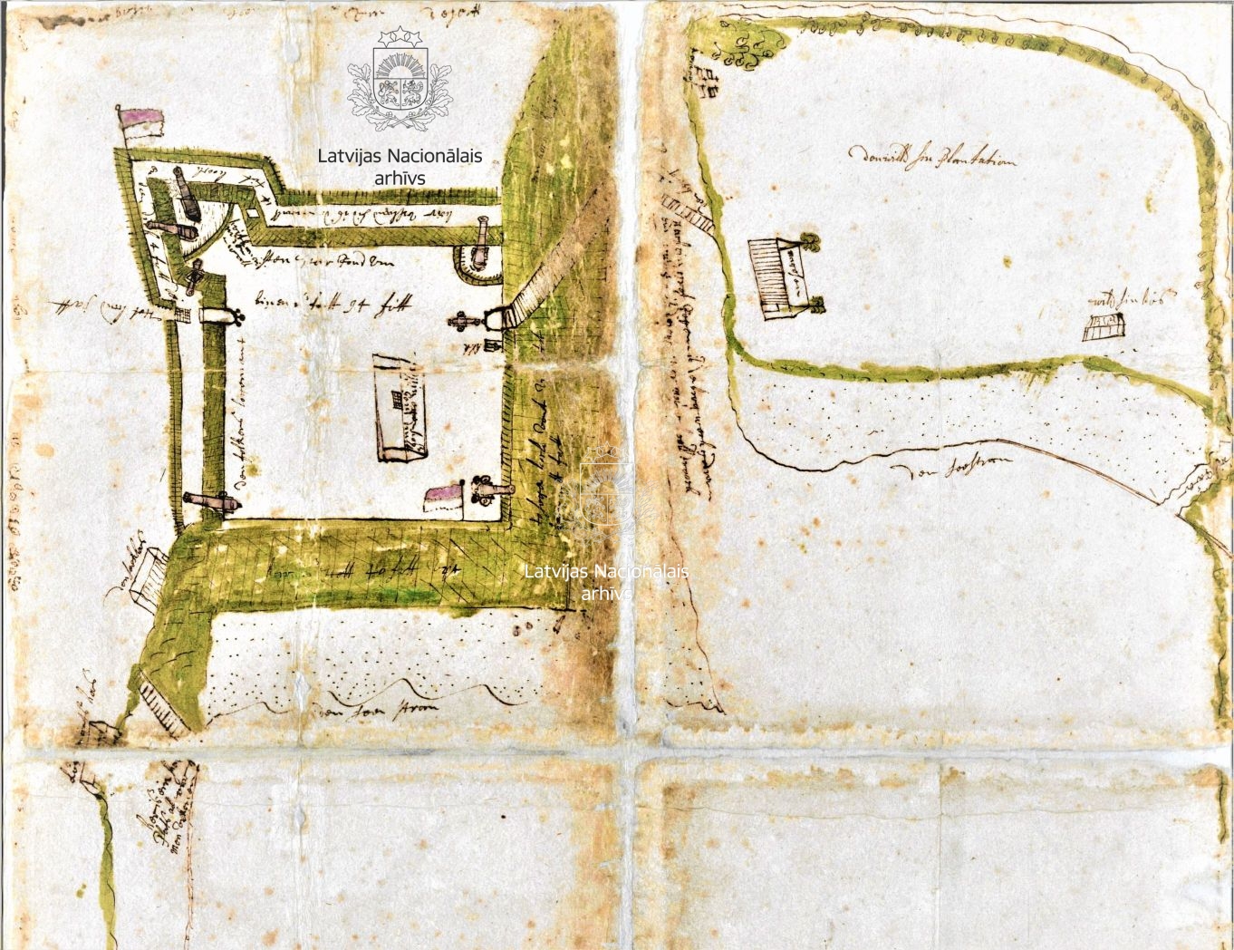 12. Plan of Fort James, established on the island of Tobago. 1654. Ink and watercolour. LVVA, collection 7363, inventory 3, file 111.