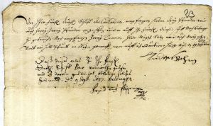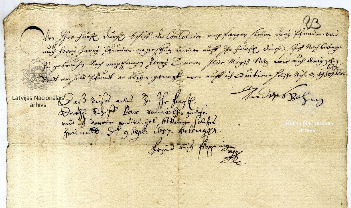 13. Receipt signed by Andreas Bohm, head of the expedition to Tobago, and the duke’s factor Friedrich Pöpping. Helsingør, 9/19 September 1657. LVVA, collection 554, inventory 1, file 1026, p. 23.