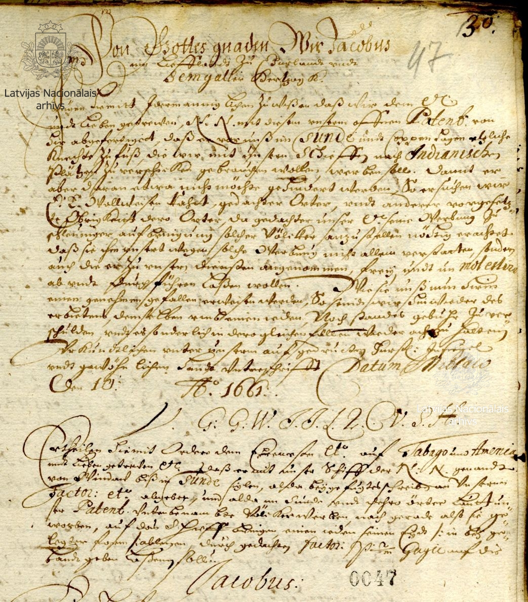 14. Form for a patent and instruction from Duke James. 10 [January] 1661. LVVA, collection 554, inventory 1, file 265, p. 47.
