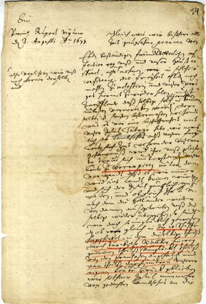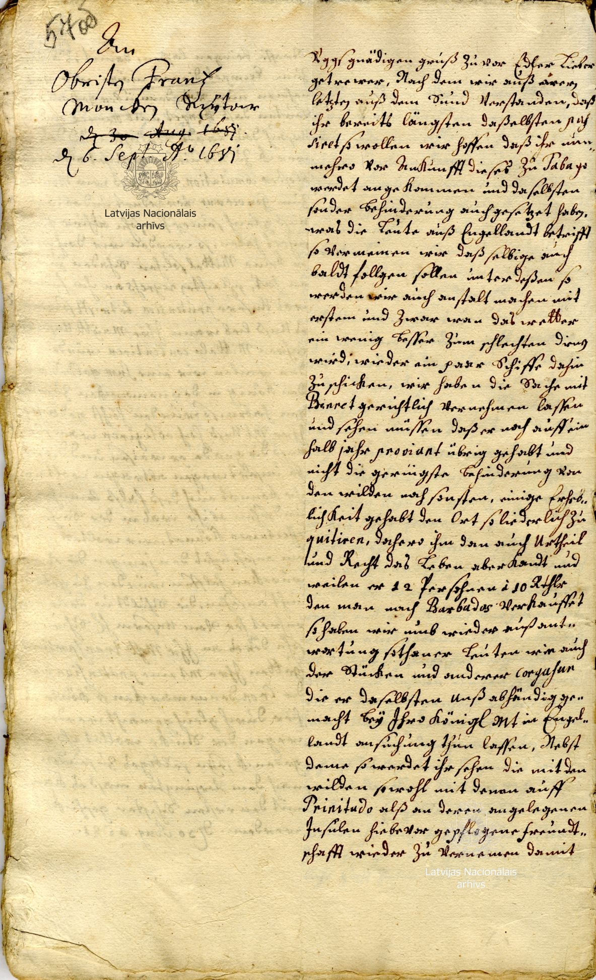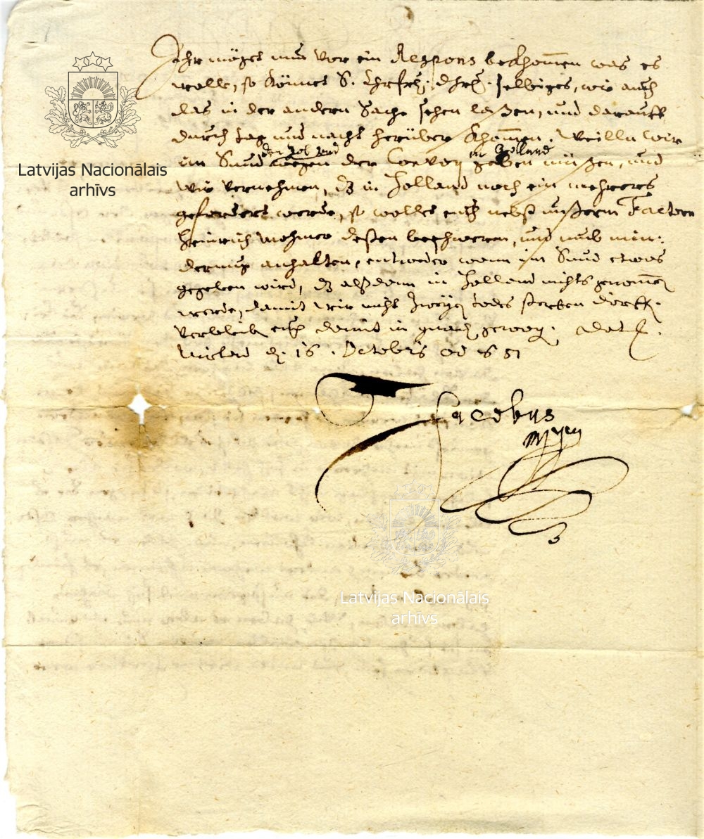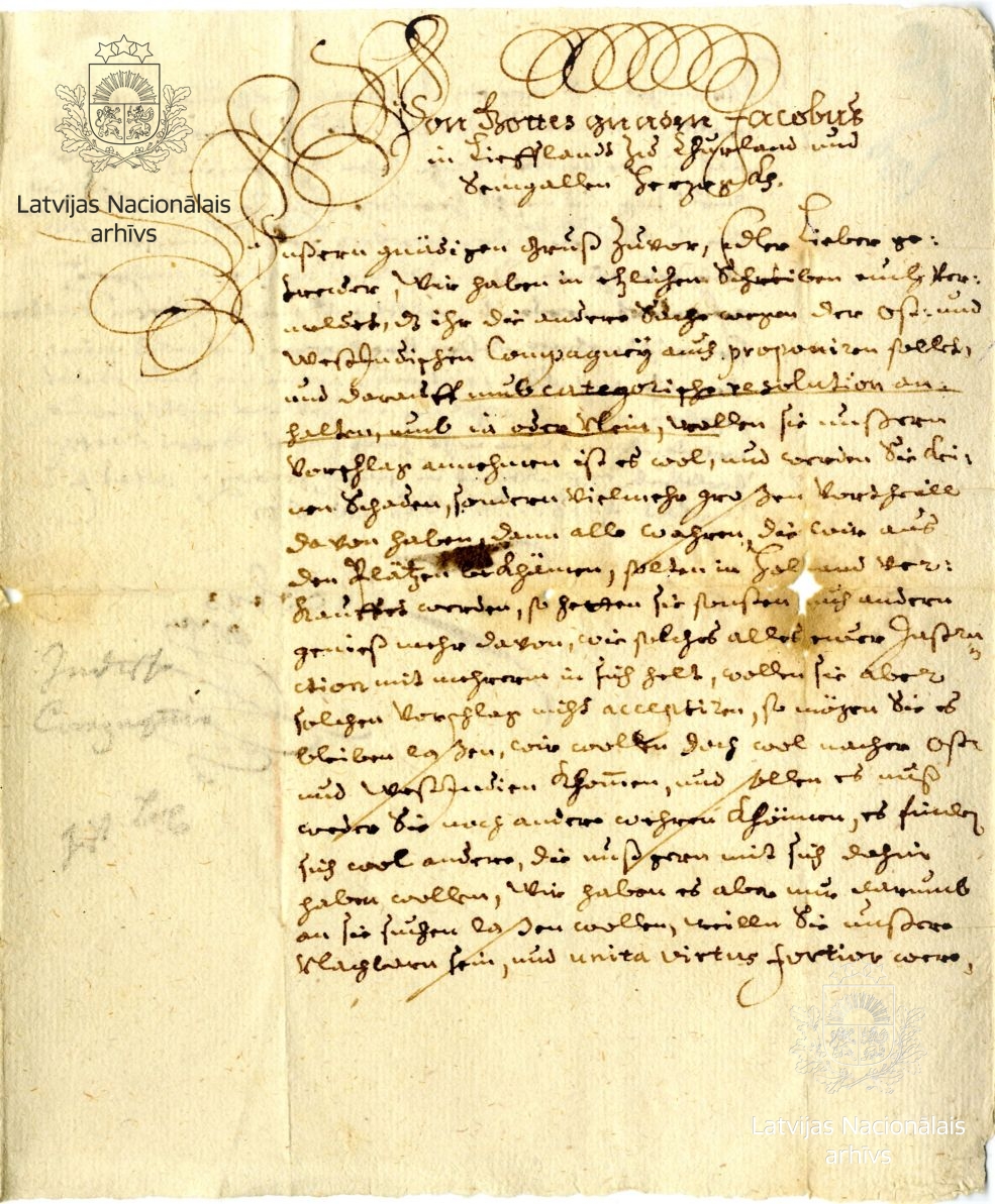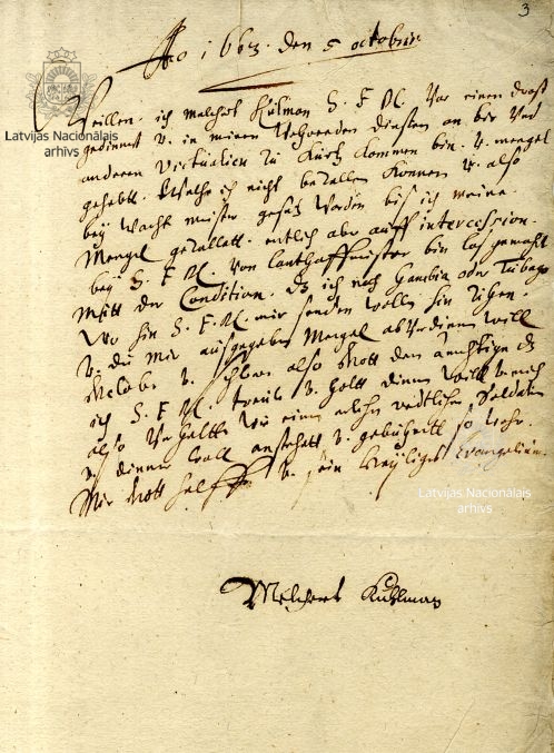 1. Letter from Duke James to Franz Hermann von Puttkamer, Duchess Louise Charlotte’s chamberlain. Mitau/Jelgava, 16 October 1651. LVVA, collection 554, inventory 2, file 2982, p. 1.