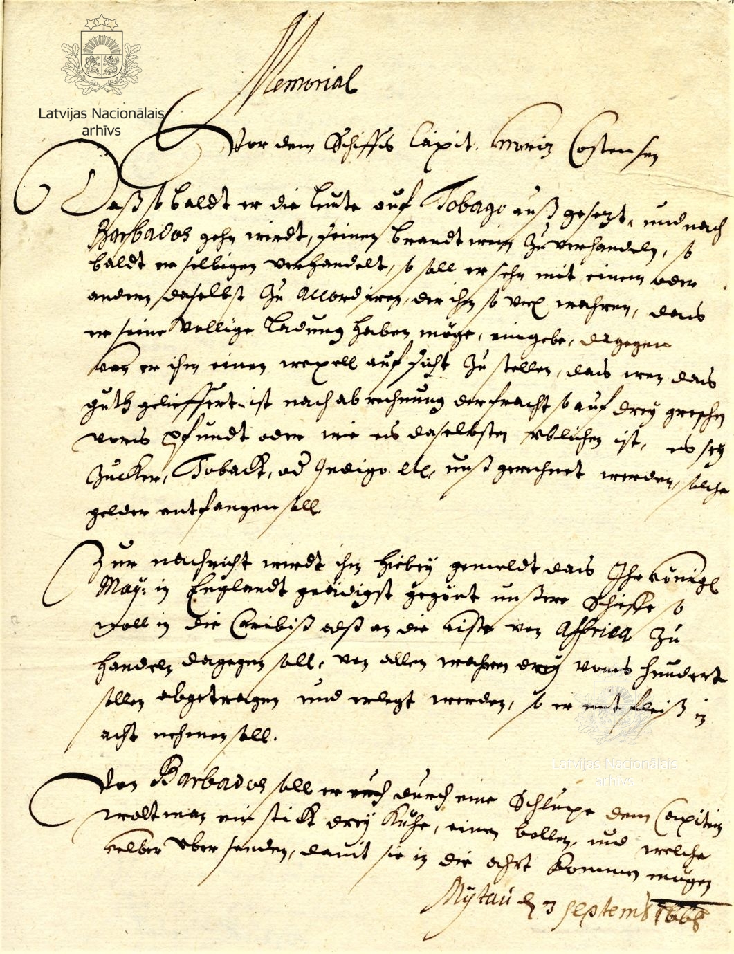 The memorial supplements an order issued that same day by the duke for Castens (also Carstens) to take the ship Isslandsfahrer (Island Voyager) to the Öresund, where he was to enlist a crew for a voyage to Tobago and help Captain Hans Georg Waltmann to recruit 40 men in Copenhagen for the garrison. Once he arrived on Tobago, Castens was to land Waltmann and his men on the island, while he himself was to go to Barbados, where he was to exchange a cargo of vodka for tobacco, sugar, ginger, cotton and other goods, which he was to bring back to the Öresund. If there was still space on the ship, then he was also permitted to carry other cargoes, for which he was to charge shipping costs. Castens had to send some three cattle, bulls and some calves to from Barbados to Tobago.
