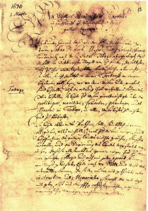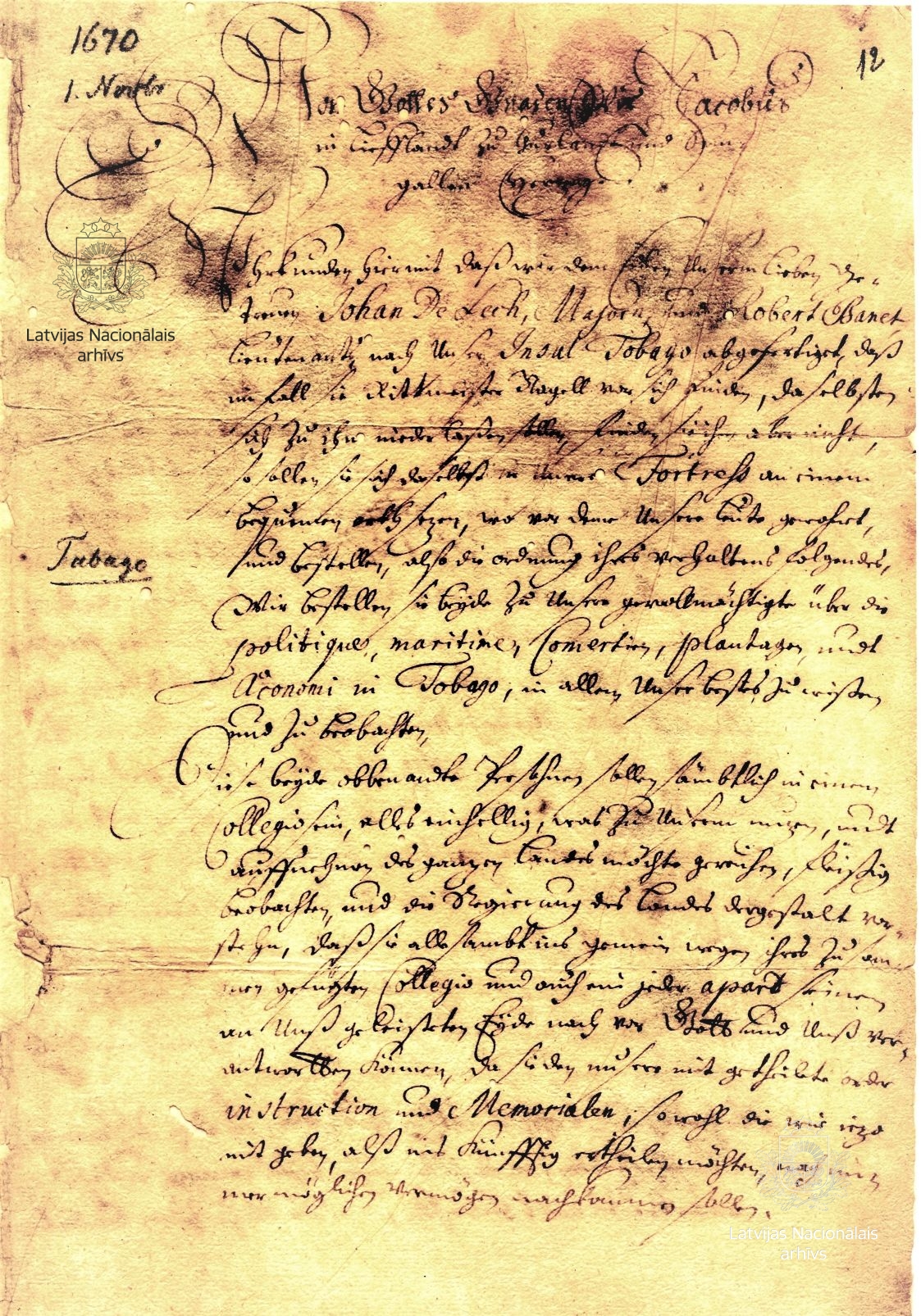 18. Instruction to Major Johann de Lech and Lieutenant Robert Bennet (also Banet), whom the duke was sending to Tobago. Mitau/Jelgava, 1 November 1670. Authenticated transcript. First page. LVVA, collection 554, inventory 1, file 2621, pp. 12–18.