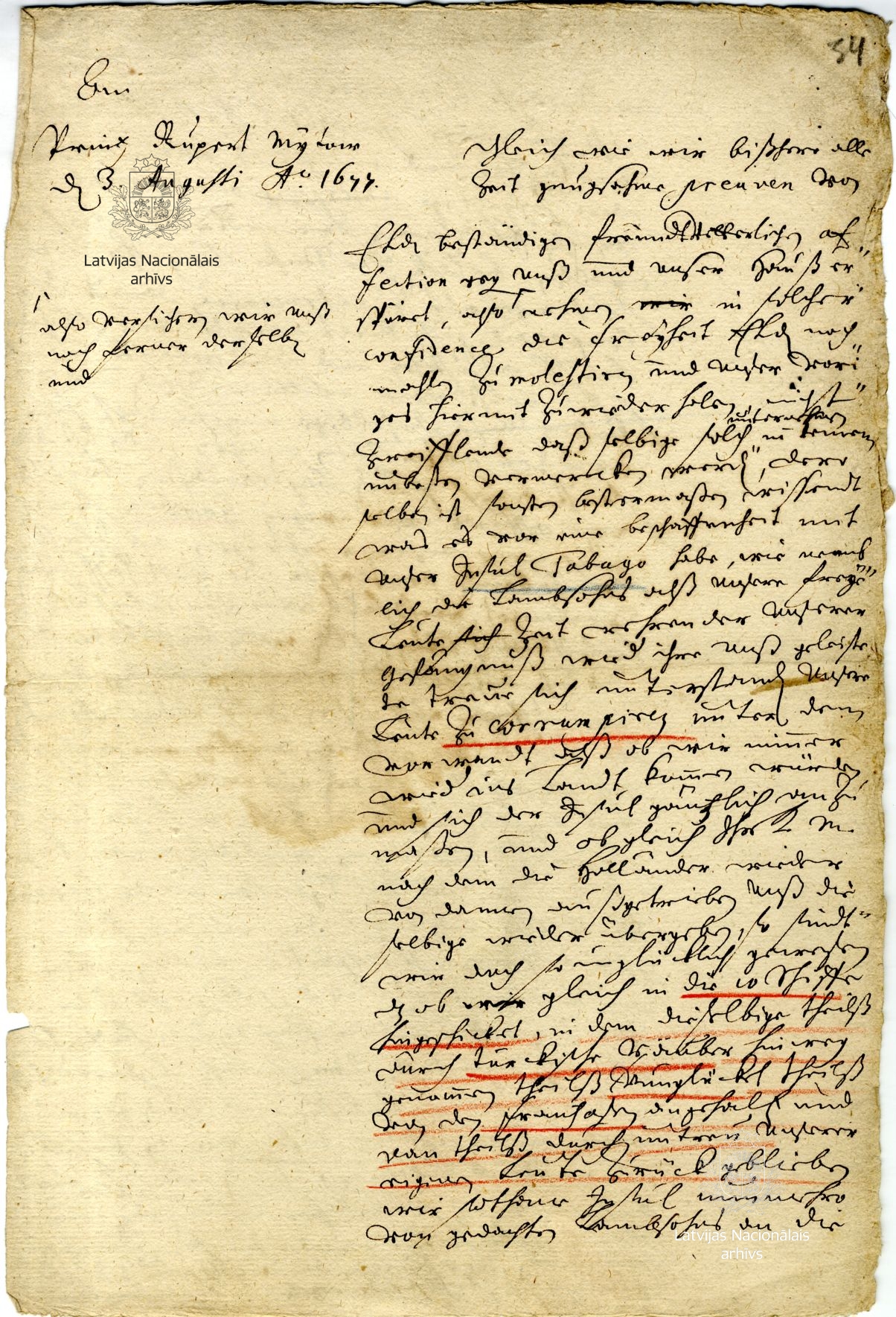 20. Letter from Duke James to Prince Rupert, cousin of the King of England. 3 August 1677. Draft. LVVA, collection 5759, inventory 2, file 1326, p. 34.
