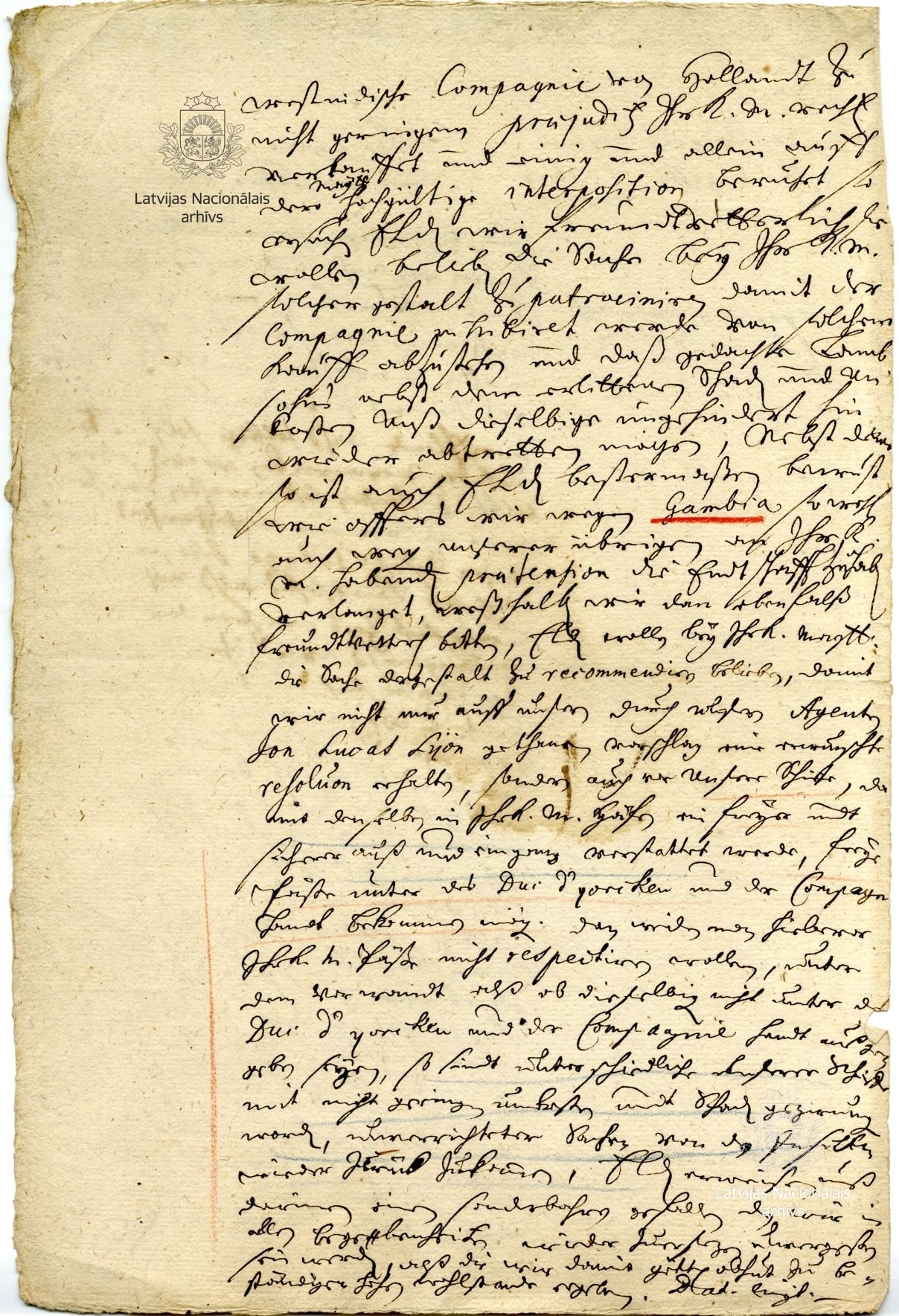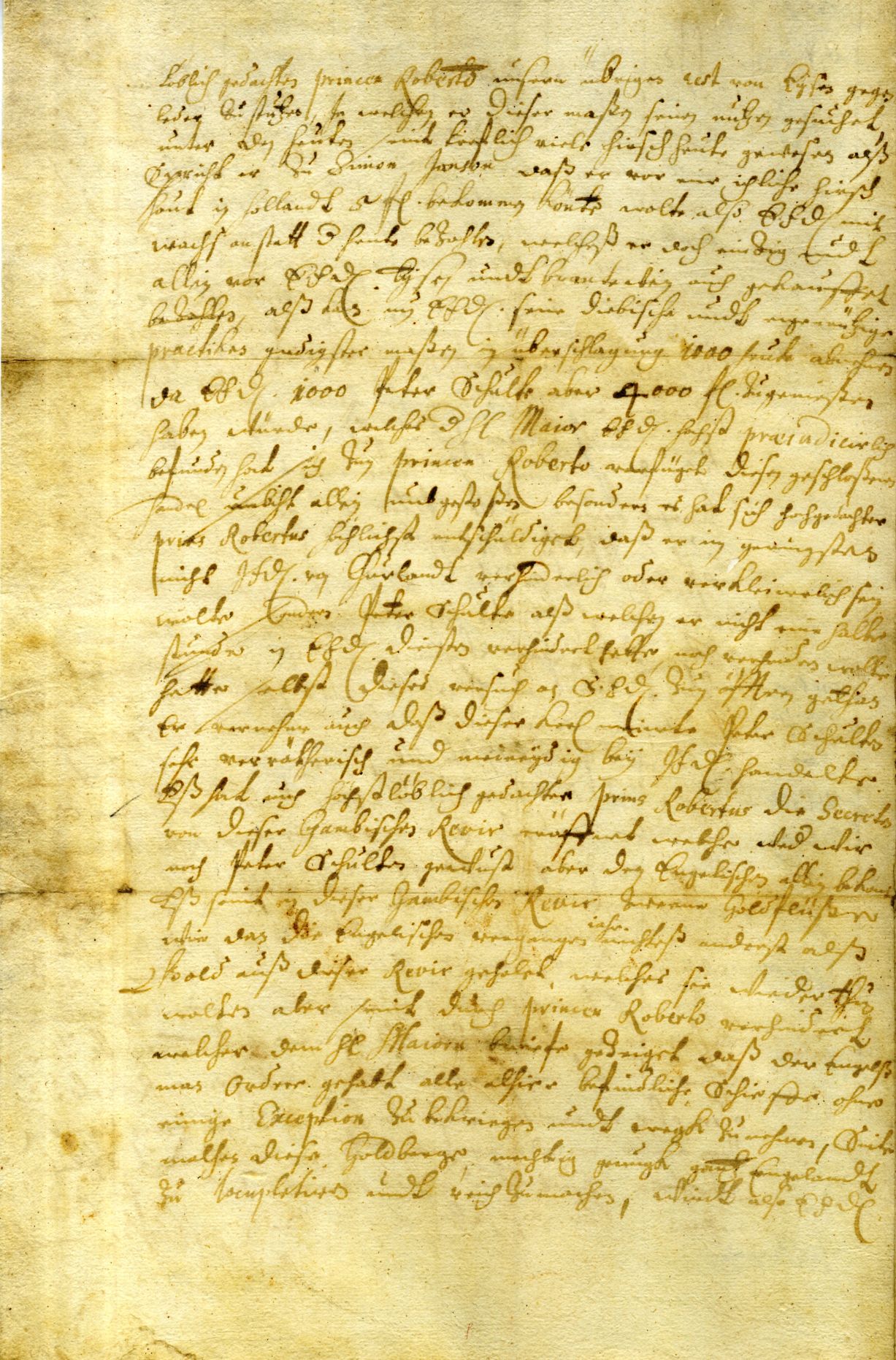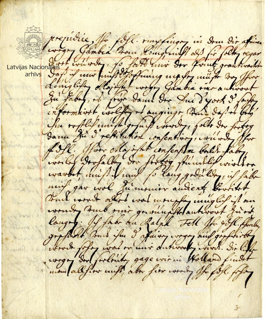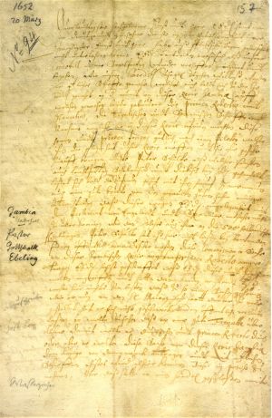 Ebeling tells of how the duke’s ship Crocodill encountered the ships of prince Rupert of the Rhine, Duke of Cumberland (Ruprecht von der Pfalz, 1619–1682, referred to in the letter as Robert) in the mouth of the river Gambia. They were privateers preying on English Parliamentarian and Spanish ships. Rupert had revealed to the Courlanders that gold could be obtained from two of the tributaries of the Gambia. Accordingly, Ebeling suggests to the duke that he might send some strong ships and yachts for navigating the river. At the same time, the pastor accuses Peter Schulte, captain of the Crocodill, of betraying the duke’s interests, possibly because there was strife between the two men.