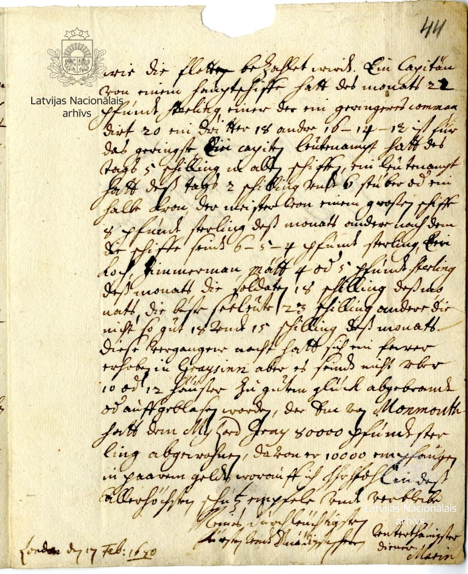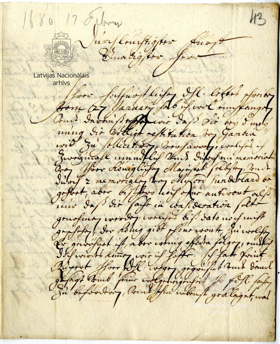 21. Letter from agent Abraham Marin to Duke James. London, 17 February 1680 [old style]. LVVA, collection 5759, inventory 2, file 1326, pp. 43–44.