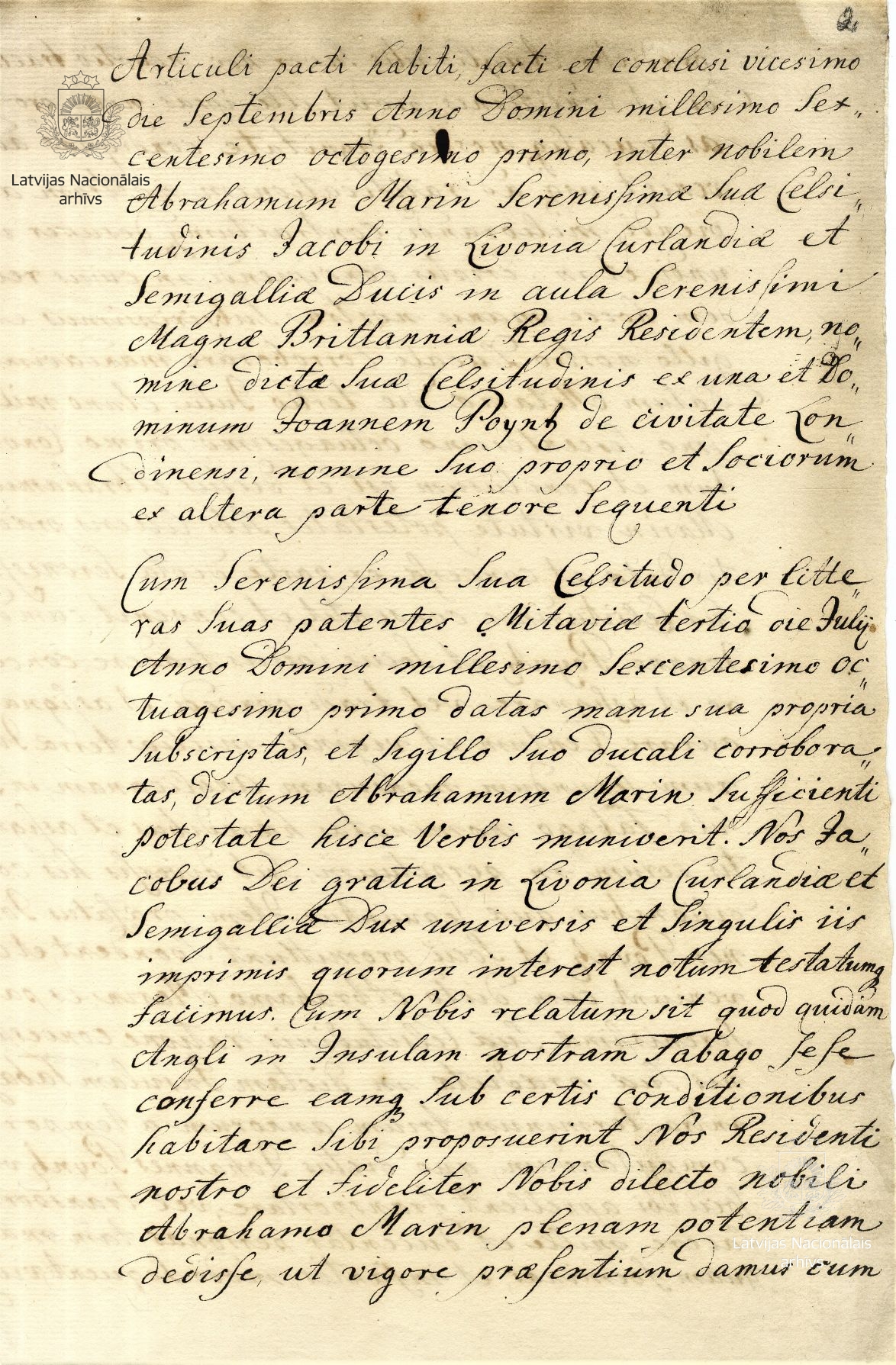 22. Agreement between Duke James of Courland and Captain John Poyntz, subject of the King of England. London, 20 September 1681. [old style]. Transcript. LVVA, collection 554, inventory 3, file 388, pp. 2–5.
