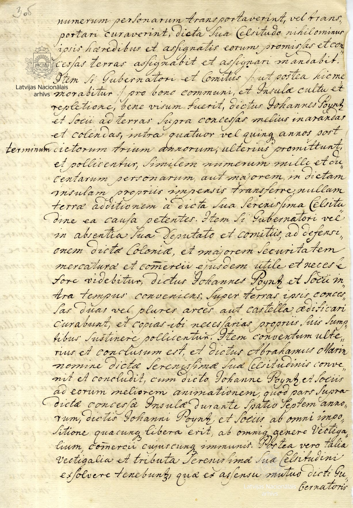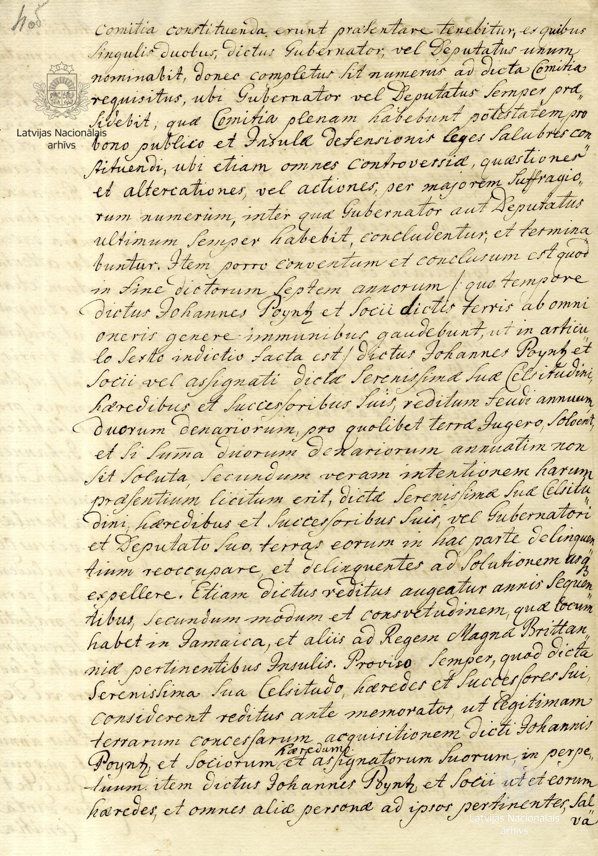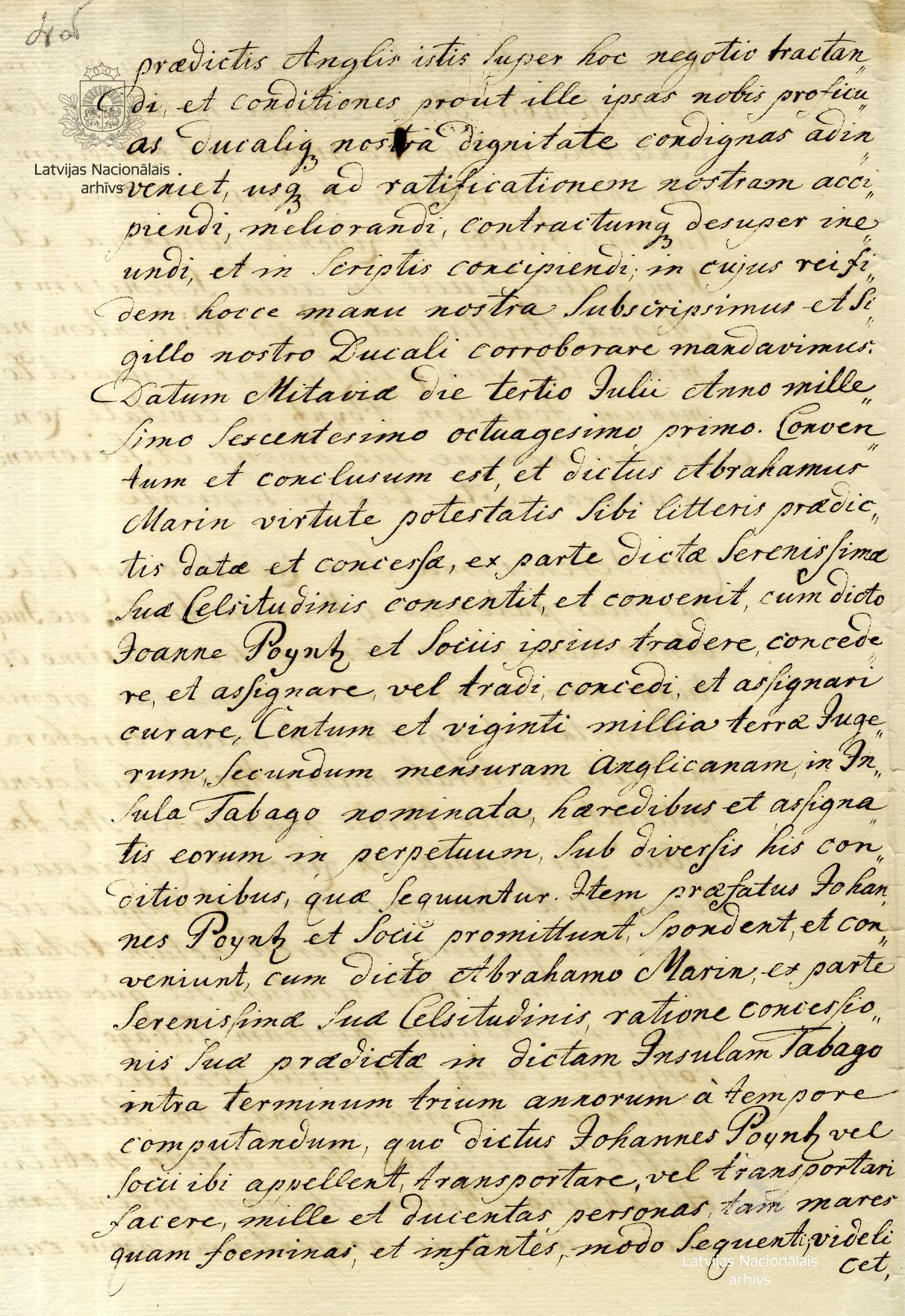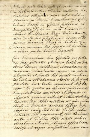 The agreement was concluded by Abraham Marin, James’s agent in London, in accordance with an authority from the duke. Under the agreement, Poyntz and his companions undertook to send 1200 colonists to Tobago, who were to cultivate the island under the auspices of the Duke of Courland, receiving a total of 120,000 acres of land. Even though James ratified the agreement on 24 October 1681, friction on particular issues continued. For example, the English side wished to appoint a governor of their own, alongside the duke’s governor. Duke James’s death on 31 December 1681 as well as the obstacles created by the English government meant that the agreement remained unfulfilled, even though Poyntz continued to seek its implementation for many years.