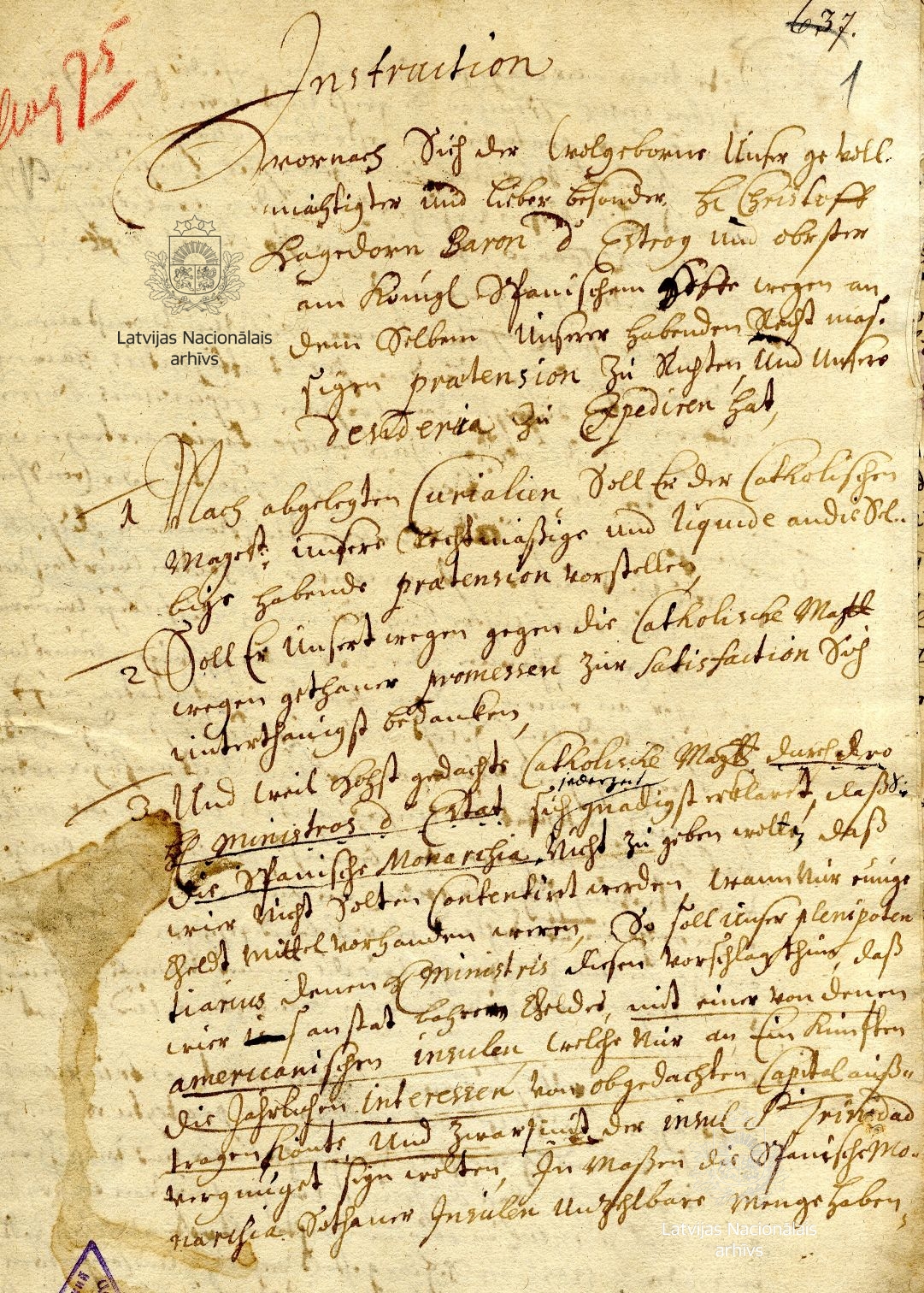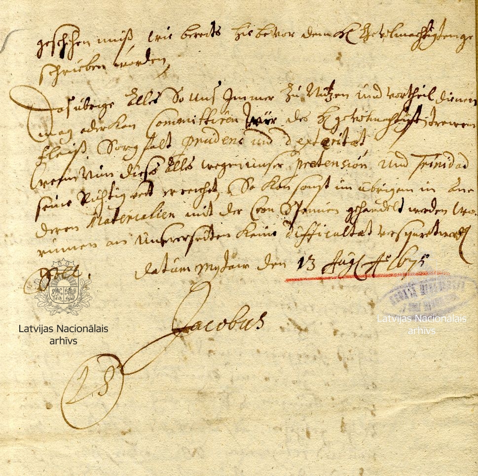 24. Instruction from Duke James to Christoff Hagedorn, Baron d’Estroy, his envoy at the court of the King of Spain. Mitau/Jelgava, 13 August 1675. Transcript. LVVA, collection 554, inventory 1, file 724, pp. 1–2.