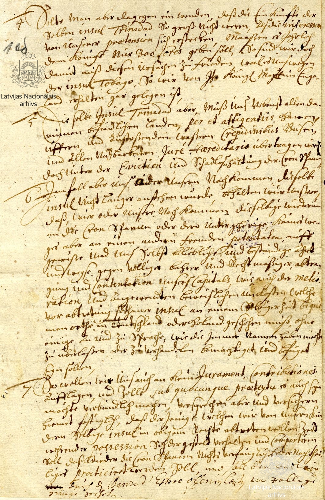 According to the duke’s instruction, Hagedorn was to request an audience with the King of Spain, in order to thank him for his promise to pay the duke compensation as soon as money was available and propose that instead of payment in cash, the king might grant James the right to the island of Trinidad, located near Tobago, until such time as the duke could compensate his losses. James promises not to hand over Trinidad to any other power and not to hinder the activities of the Jesuits or the Catholic Church as such on the island.