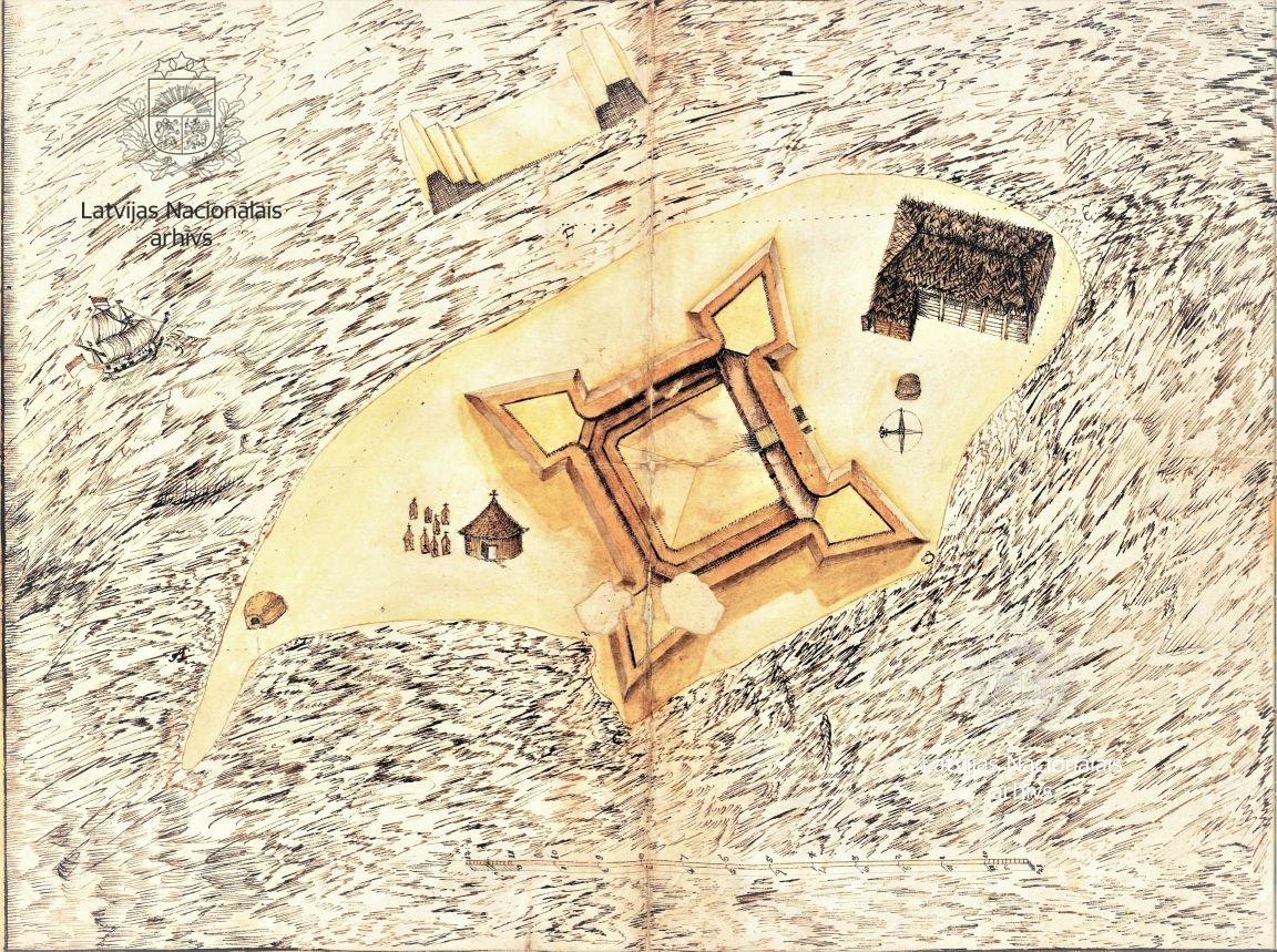 The place names on the map bear evidence to the presence of the Courlanders on the island – Jacobi-fort from the name of Duke Jacob (James), Benets bay from the name of Robert Bennet, and Moncks Fort. The latter originated from the name of a colonel of Scottish descent, Franz Monck, who was the last governor appointed by the Duke James and who reached the island after the duke had already passed away.