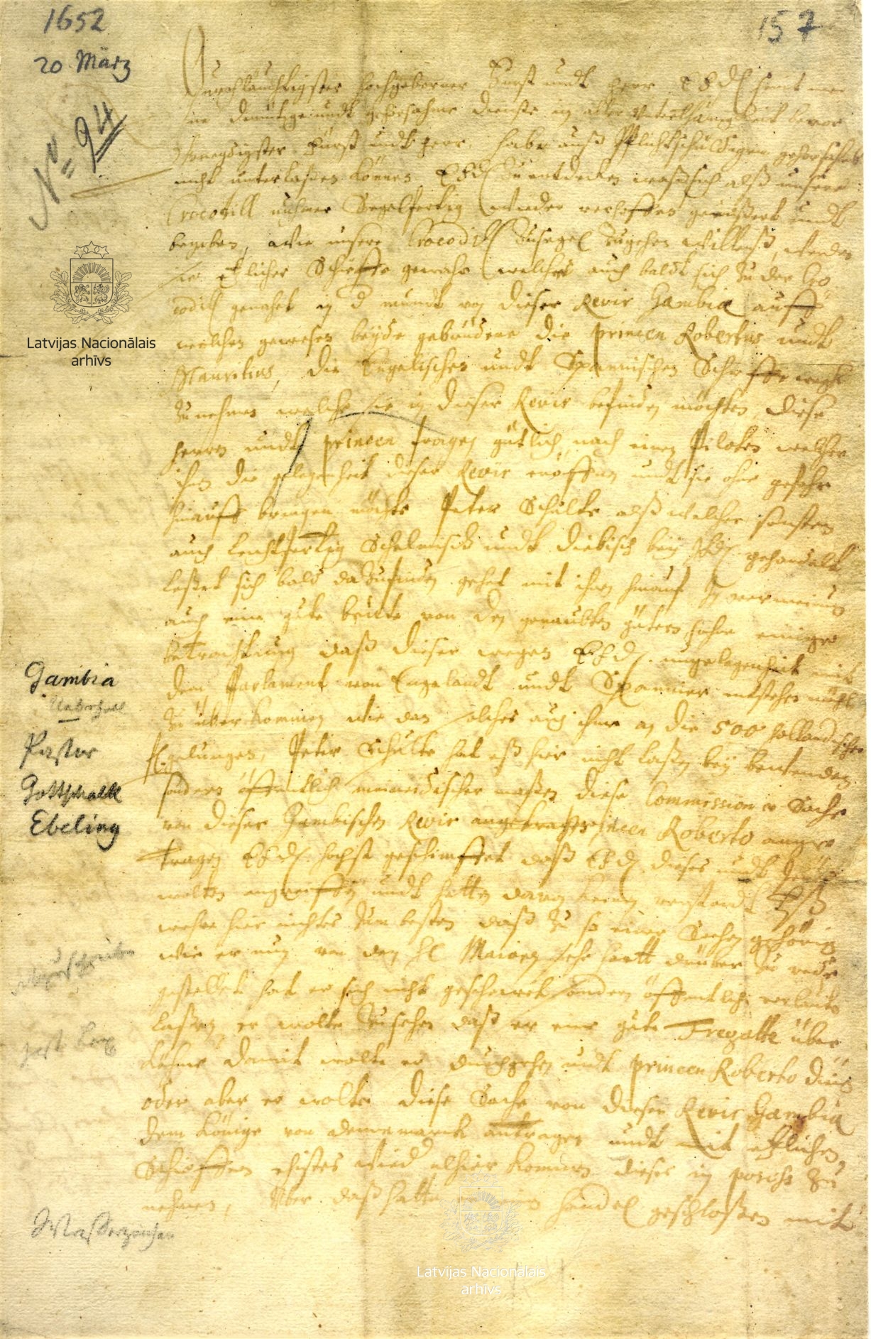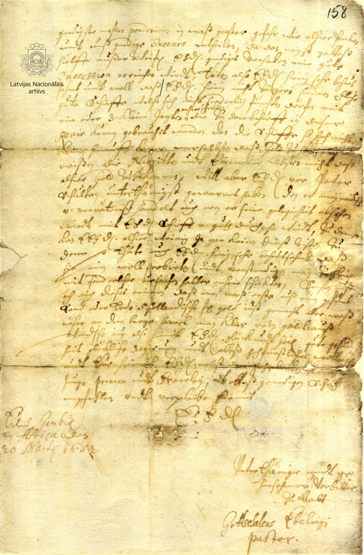 3. Letter from Pastor Gottschalck Ebeling to Duke James. Gambia Island in Africa, 20 March 1652. LVVA, collection 554, inventory 3, file 521, pp. 157–158.