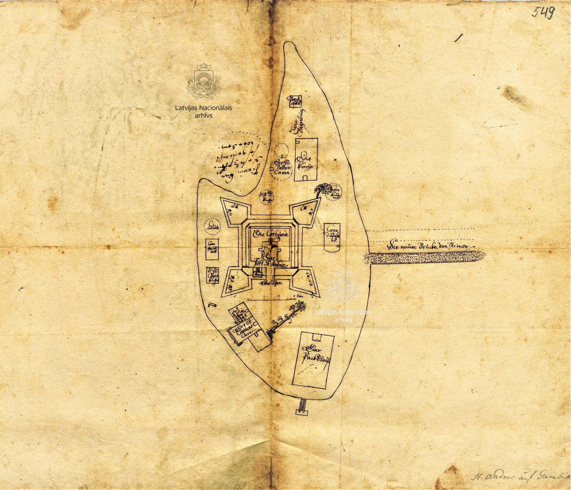 4. The trading post and fort of the Duke of Courland on St Andrew’s Island in the mouth of the River Gambia. Early 1650s. Ink. LVVA, collection 7363, inventory 3, file 111, p. 549.