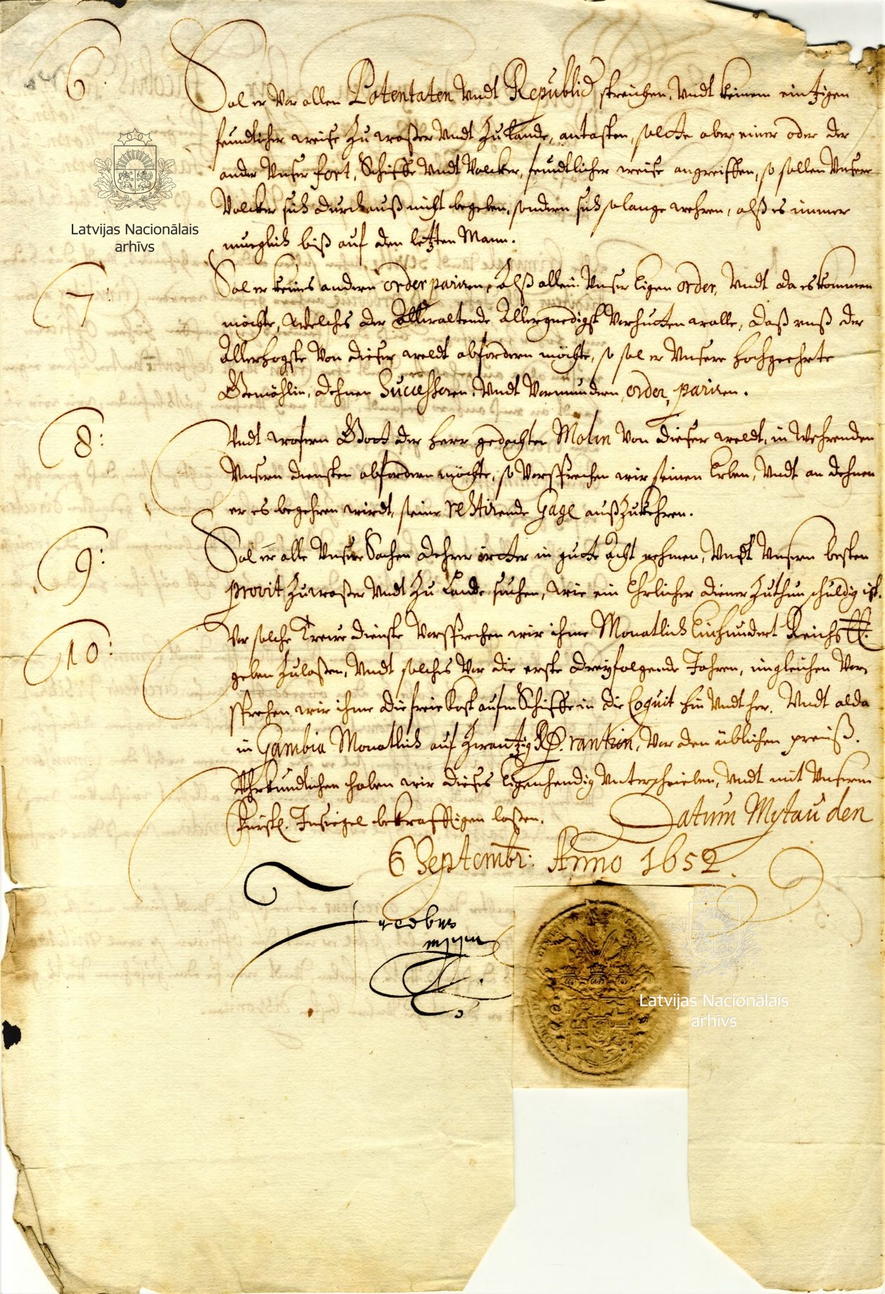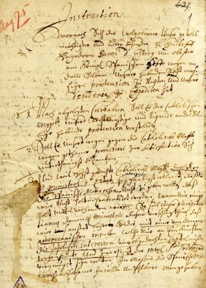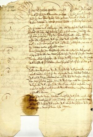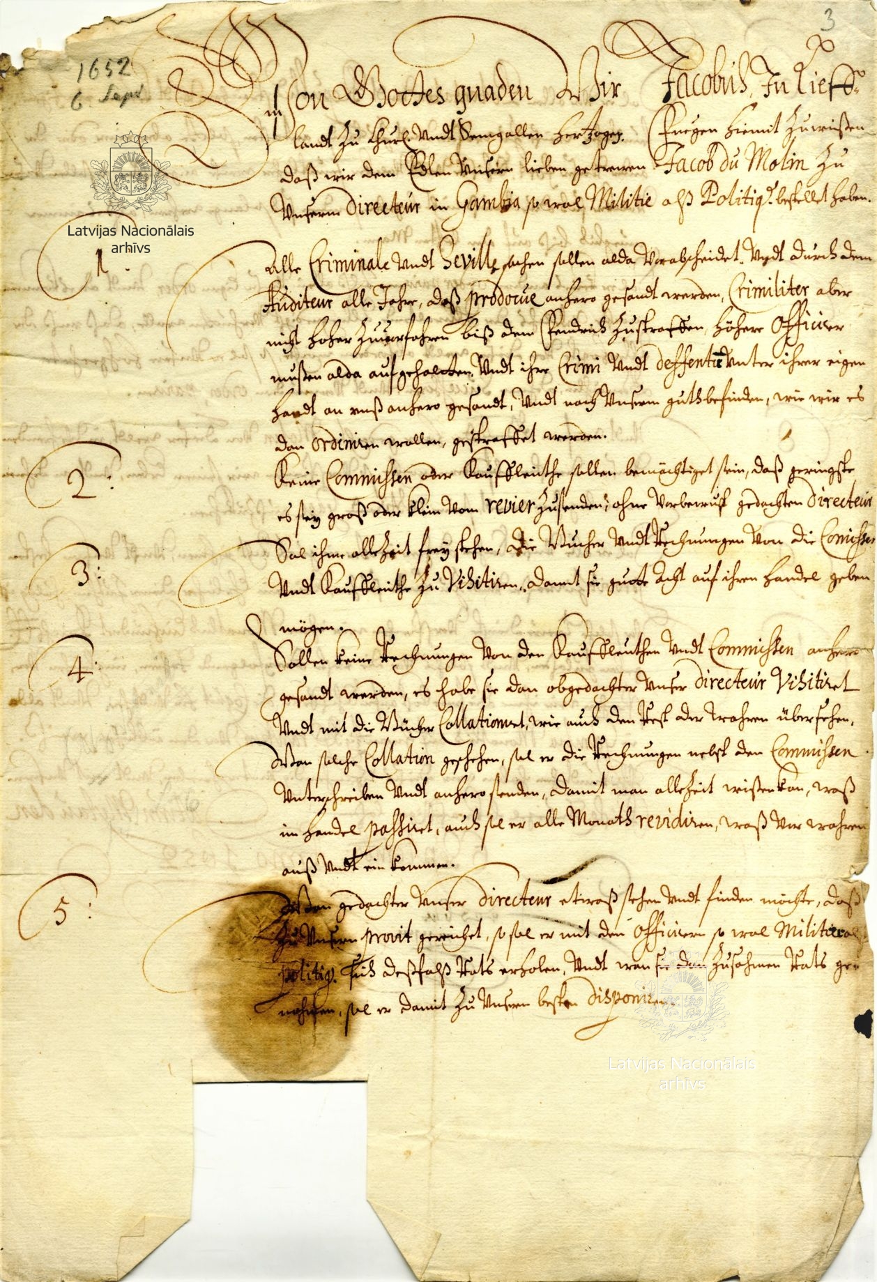 5. Instruction from Duke James on the appointment of Jacob du Moulin (also du Mollin, Mollihn) as director of the Gambia colony. Mitau/Jelgava, 6 September 1652. LVVA, collection 554, inventory 2, file 2982, p. 3.