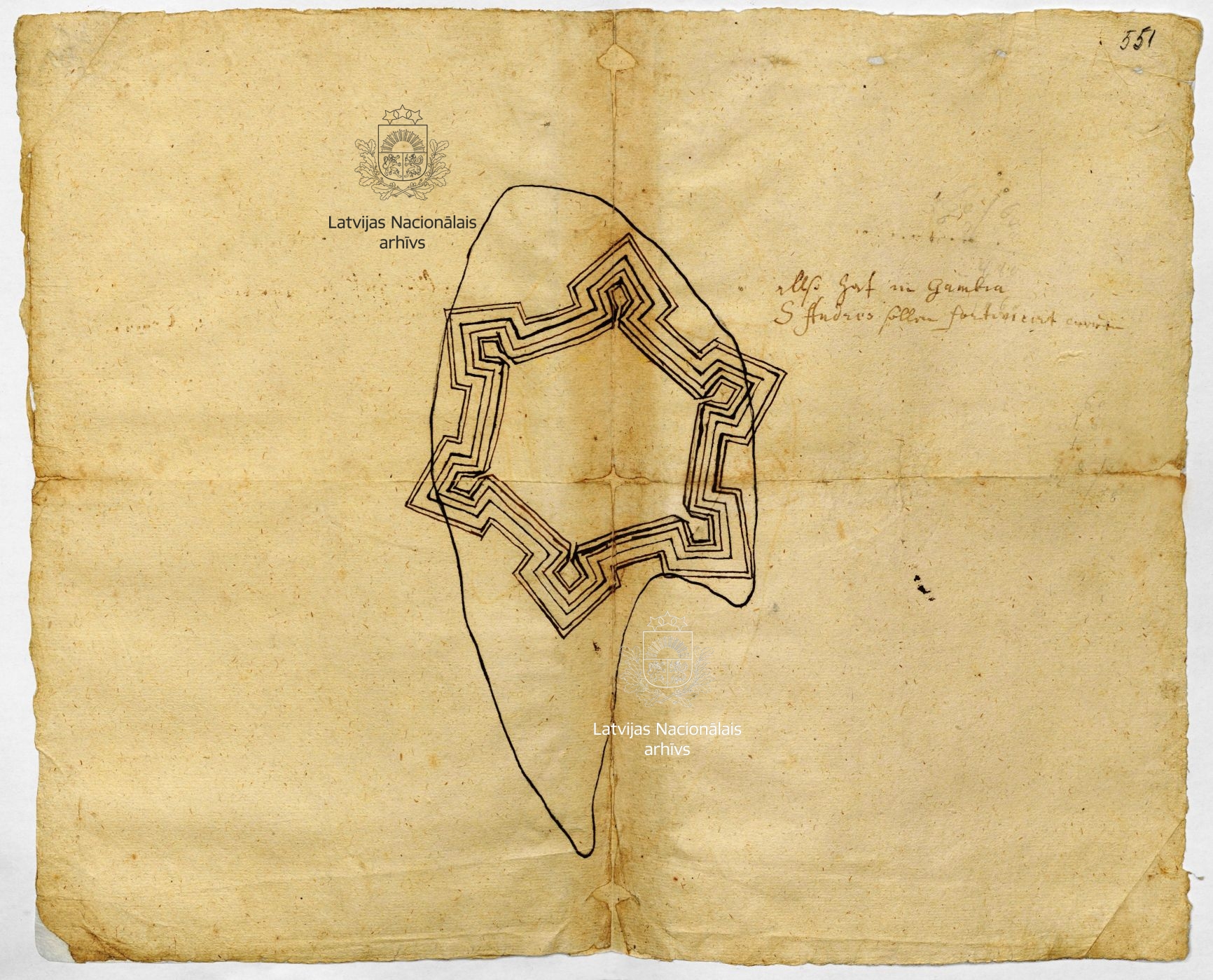 7. Sketch of a design for the Gambia fort. 1650s. LVVA, collection 7363, inventory 3, file 111, p. 551.